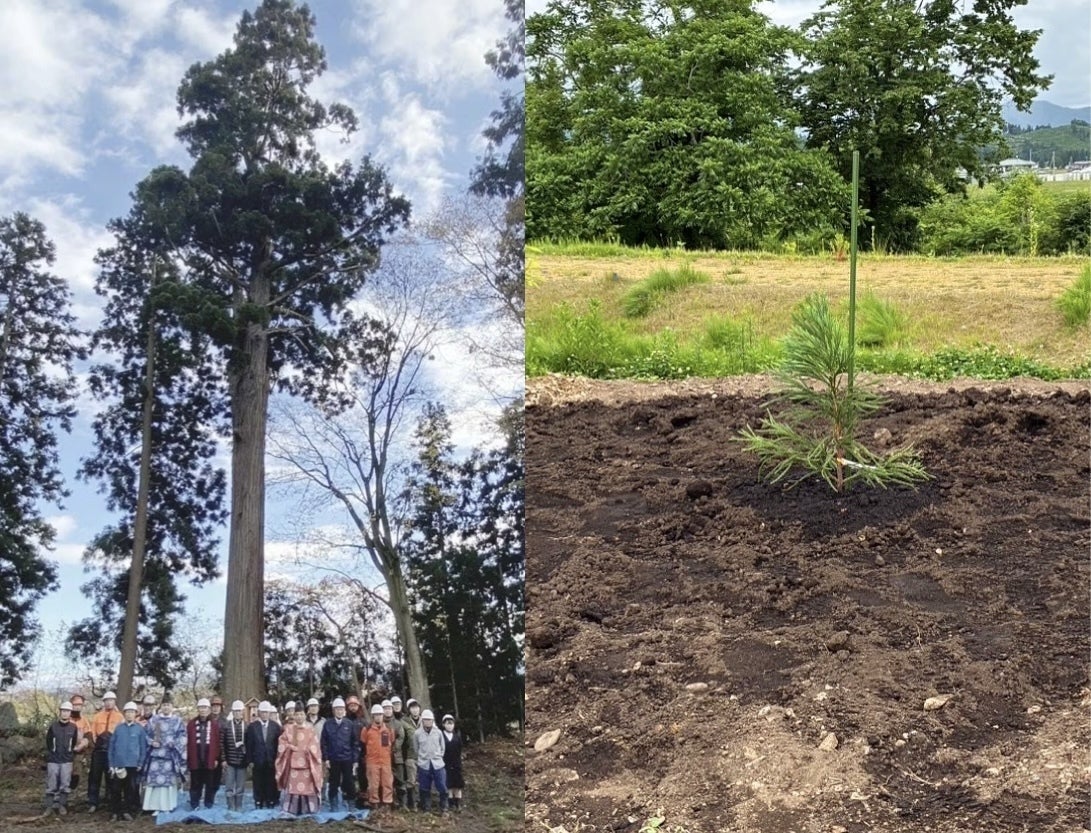 皆様のご支援により植樹された木々と同じ日に、旧境内の御神木「千年杉」の新芽を挿木にして育てた苗木が、当神社に里帰りを果たしました。