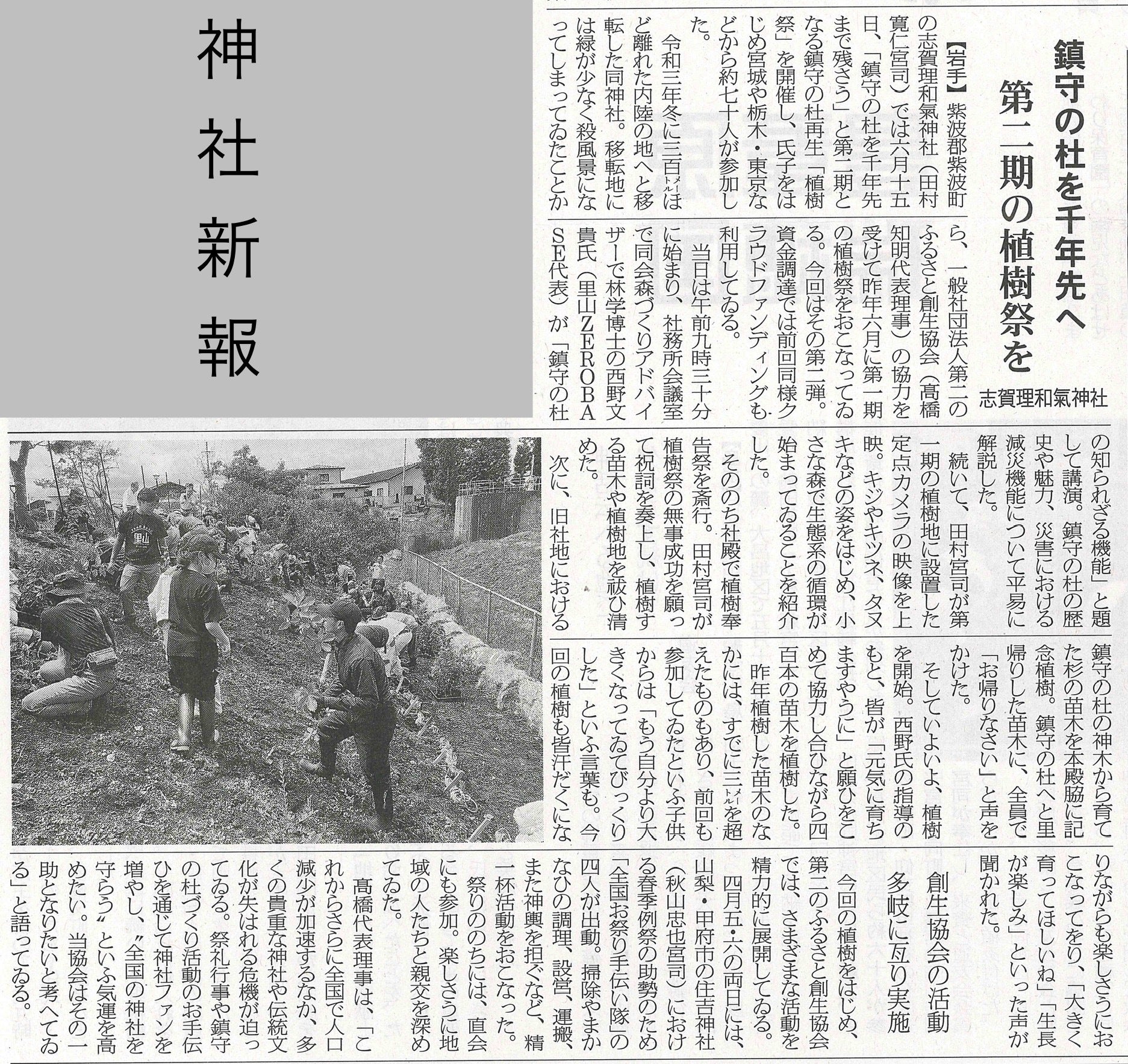 本日神社に届きました神社新報に、当神社の植樹祭と、取り組みについての記事が掲載されました。