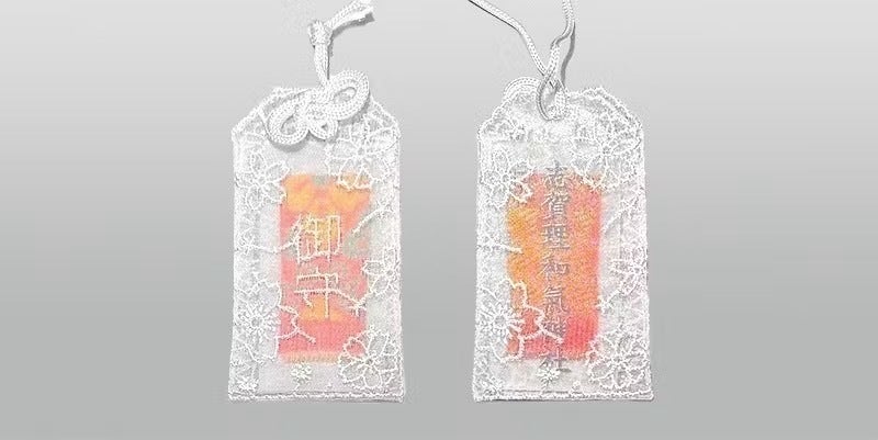 レースで刺繍されたお守り袋の中には、遷座前の本殿で、御神体を包んでいた錦の覆の一部が入れられています。