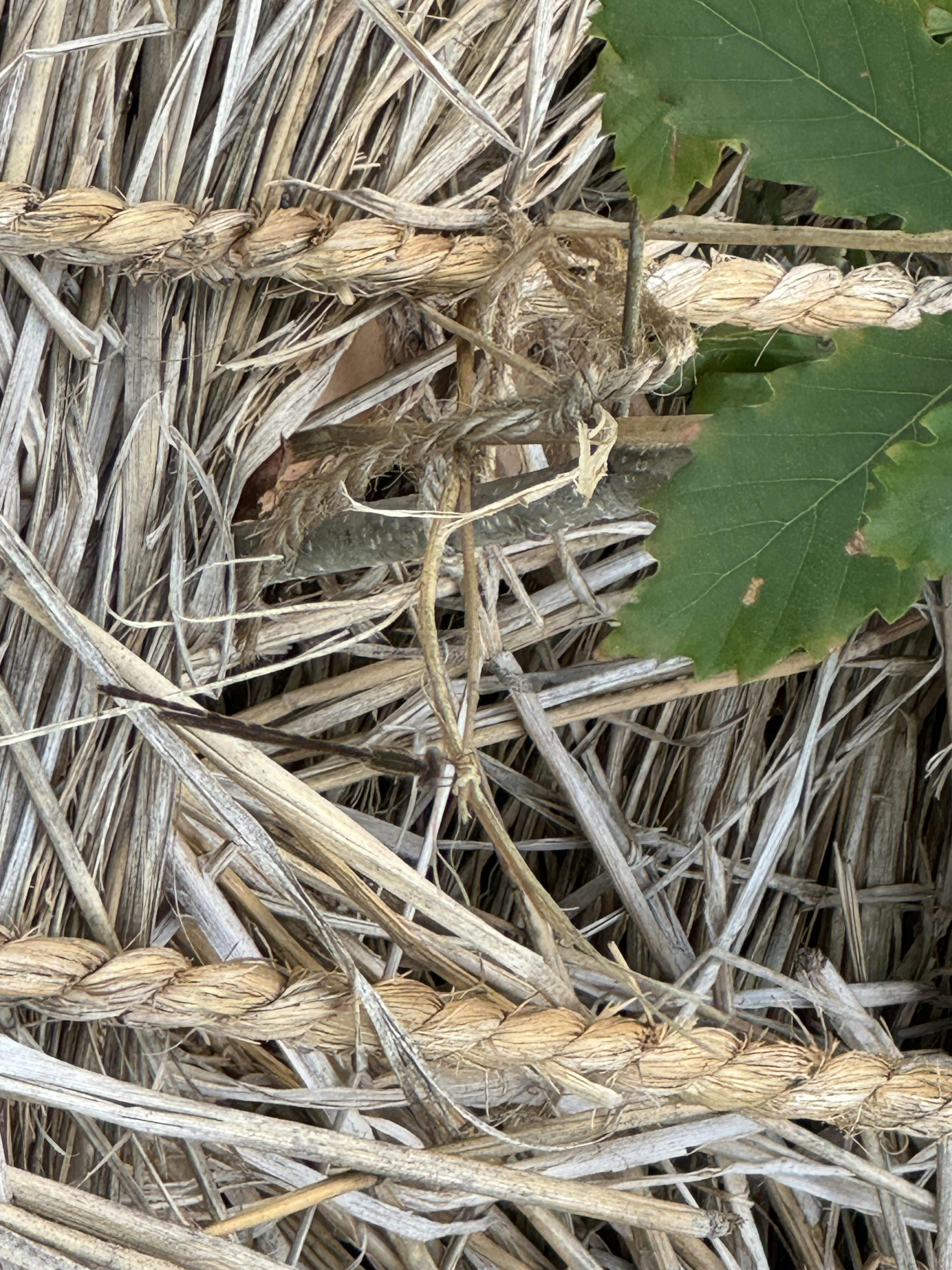 藁に紛れて見つけにくいですが、茶色の体と半透明の羽を持つ「オツネントンボ」だと思われます。
