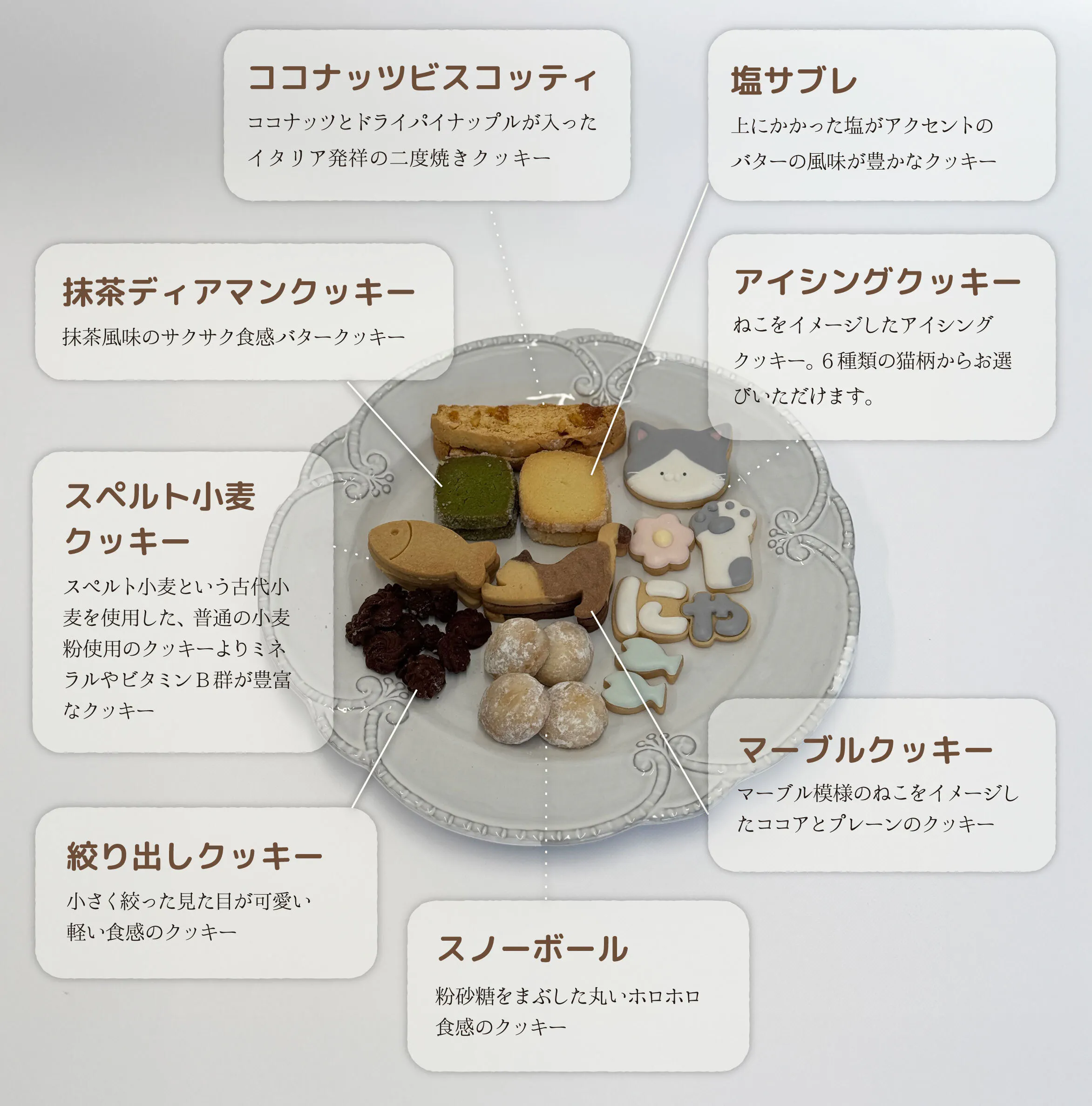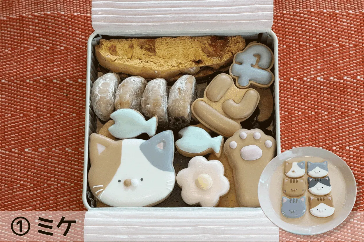 かわいいアイシングクッキーの下には、 猫型やお魚型のいろんな味のクッキーがぎっしり。