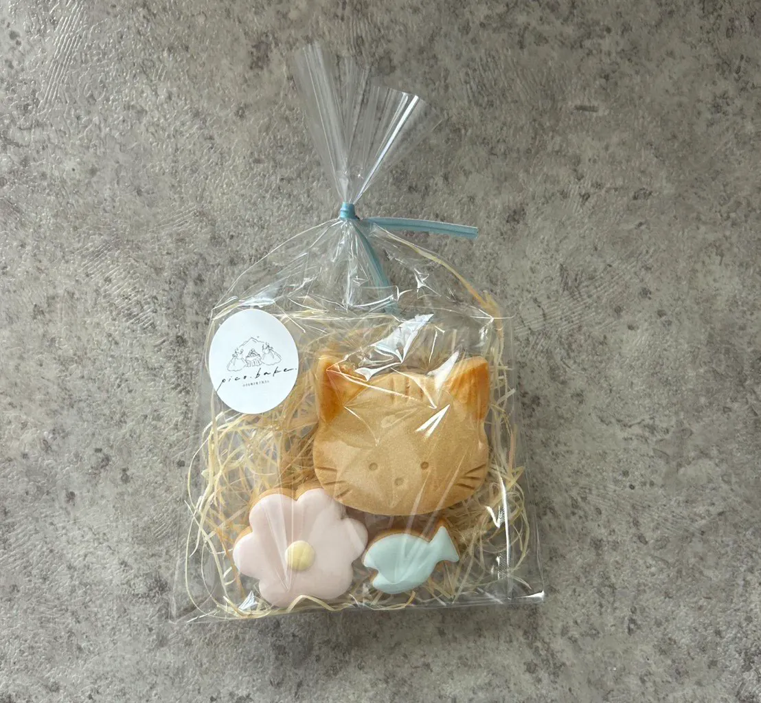 可愛い猫型クッキーに、魚とお花のアイシングクッキーも添えた3枚セットをご用意しました。