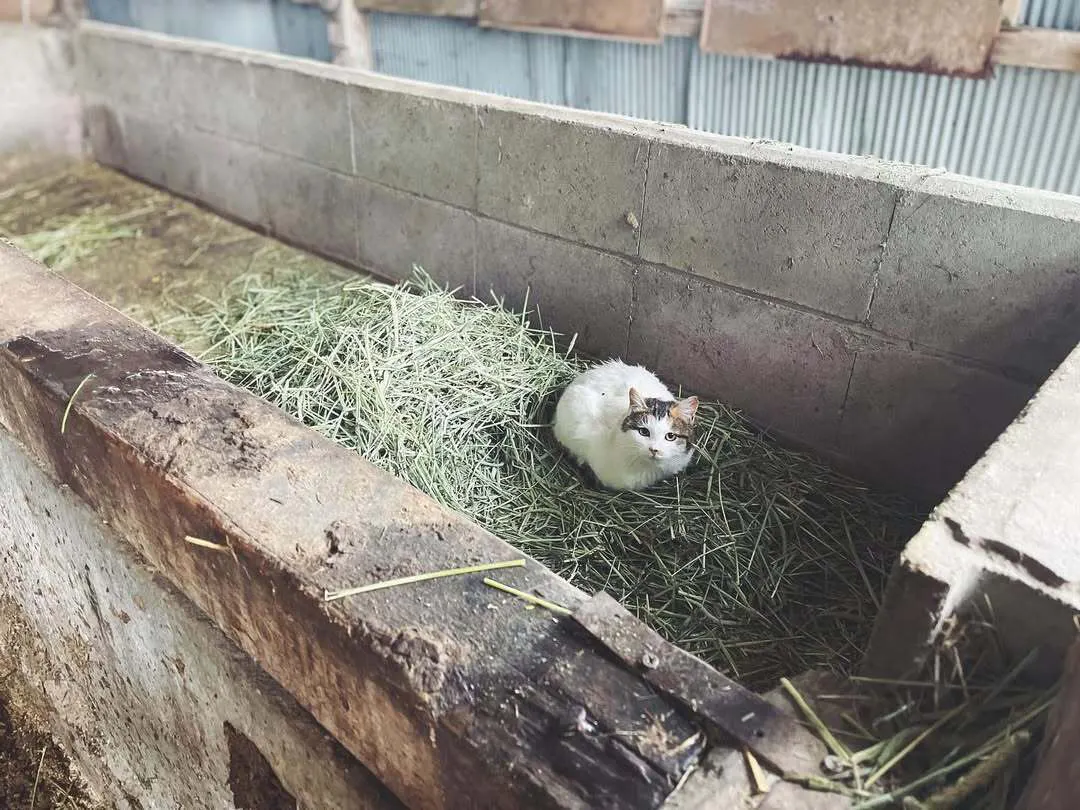 猫たちは牧場で飼われているため(牧場猫)、とても自由に過ごしているそうです。好きな場所で過ごし、好きな場所で寝る。時には、牛さんのご飯の上で寝ていることもあるとか。