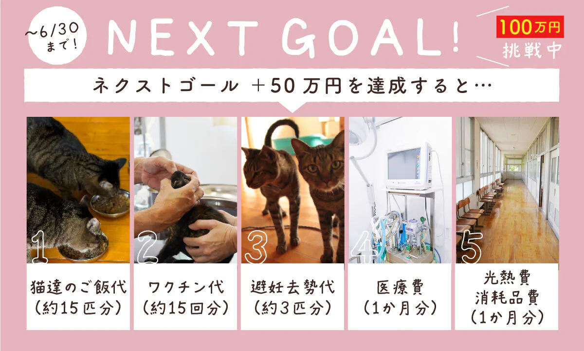 目標額は50万円としておりますが、実際に保護ねこのために使える額はその40%前後ですので、短期間の飼養費分となります。