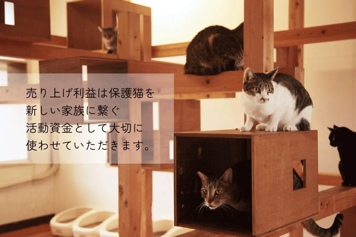 私たちは購買部という通販部を立ち上げており、グッズなどの販売をすることで、できるだけ自力で稼ぐ保護施設を目指しています。ご支援者の皆様は、グッズや猫砂などのお買い物で、保護猫活動に参加できます。いずれは販売の力だけで施設を回す(猫たちを健康的に保護して、未来へと繋げ、お世話するスタッフの給料も賄える)ことを目指して活動しています。施設の継続性=きちんと商売として成り立って猫もスタッフもそれで生活ができること、という考えによるものです。