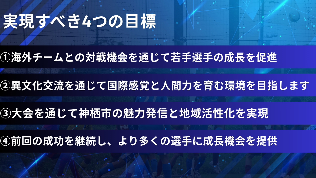 私たちは、「日本一の国際ユースサッカーフェスティバル」をつくることを目指して、2023年にこのプロジェクトを立ち上げました。