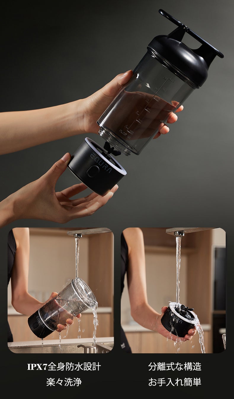 また、IPX7防水設計により、ボトル全体を水洗いしても安心。これにより、飲み残しや粉末が残る心配もなく、常に清潔を保つことができます。