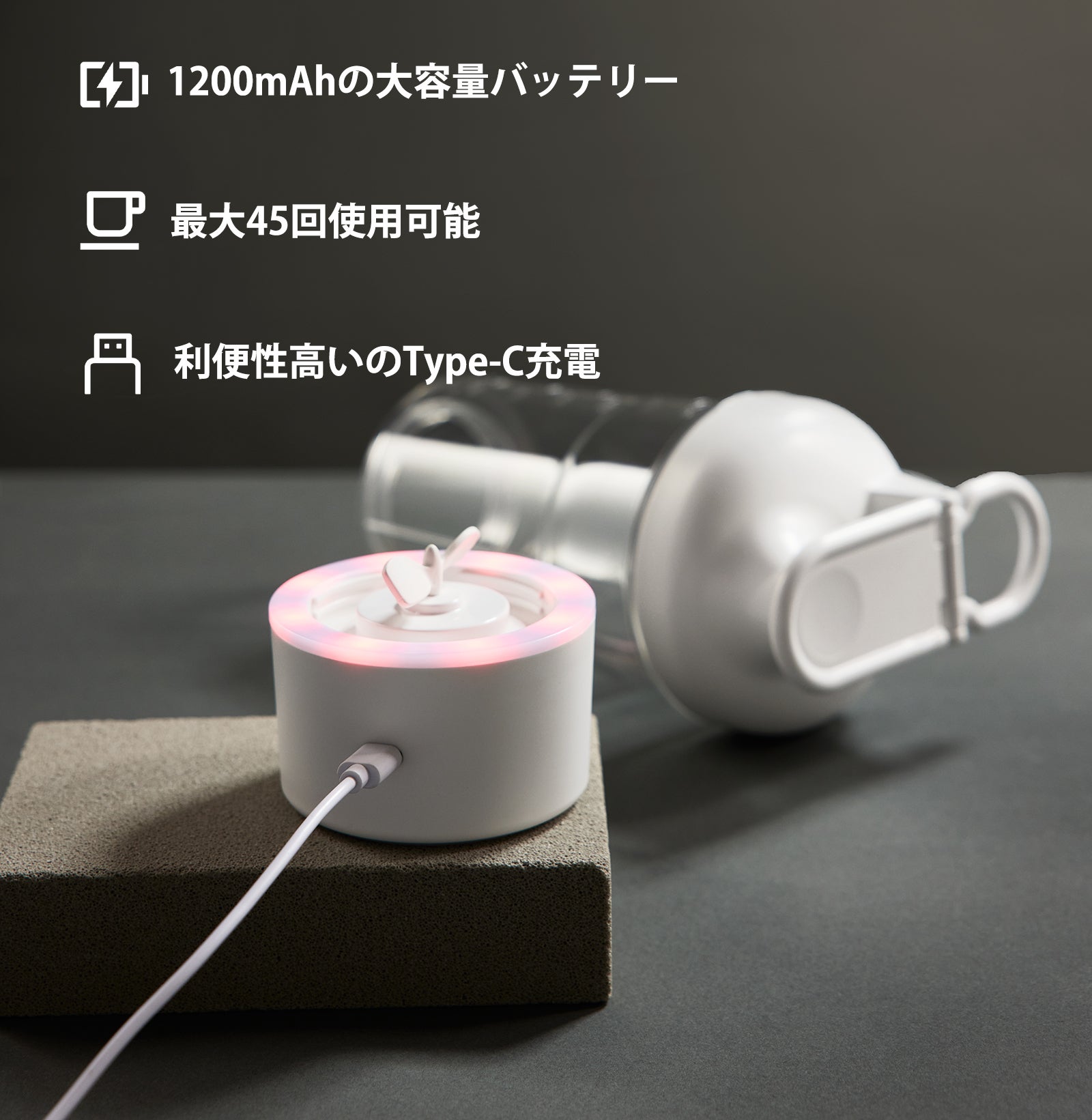 Equra電動シェイカーE-Pluseは、1200mAhの大容量バッテリーを搭載。Type-C充電に対応し、わずか2時間でフル充電が完了します。フル充電後は約45回の使用が可能で、頻繁に充電する手間が省け、外出先や旅行中でも安心して使用できます。