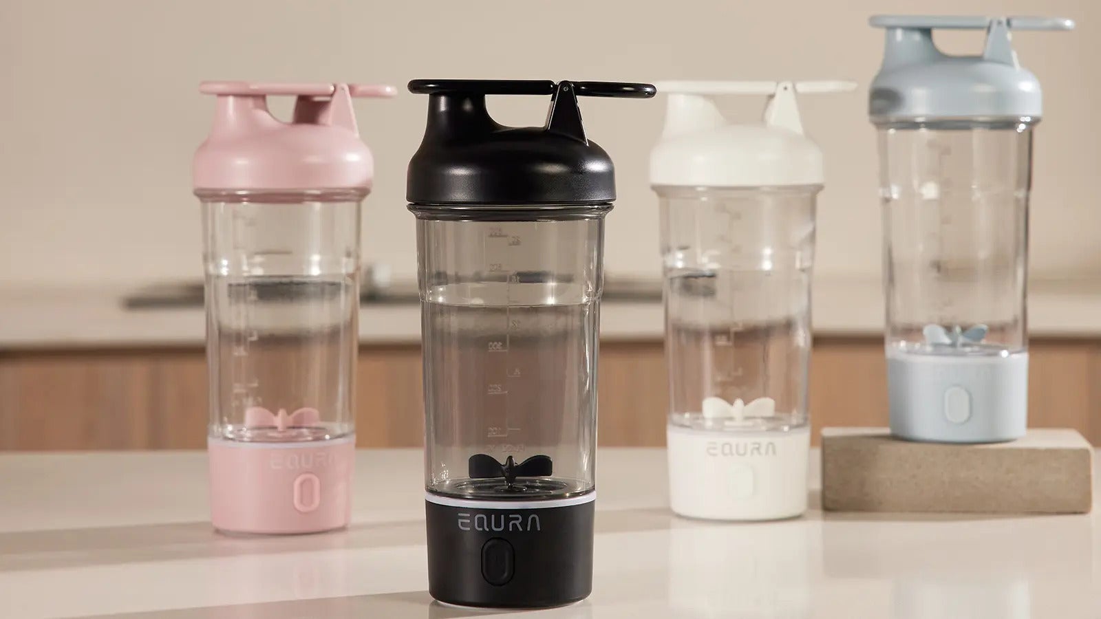 Equra電動シェイカーE-Pluseには、ブラック、ホワイト、ベビーブルーとピンクの4色展開。どの色もスタイリッシュで、日常のシーンに溶け込みます。