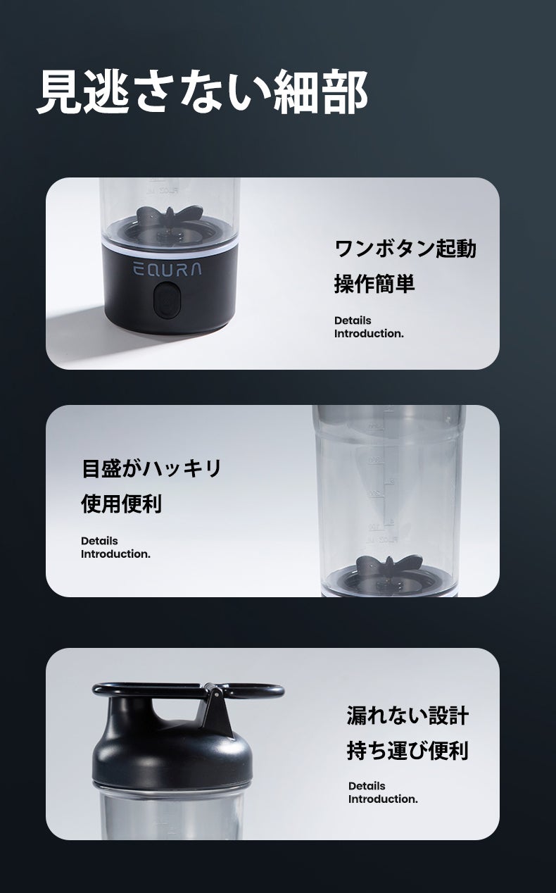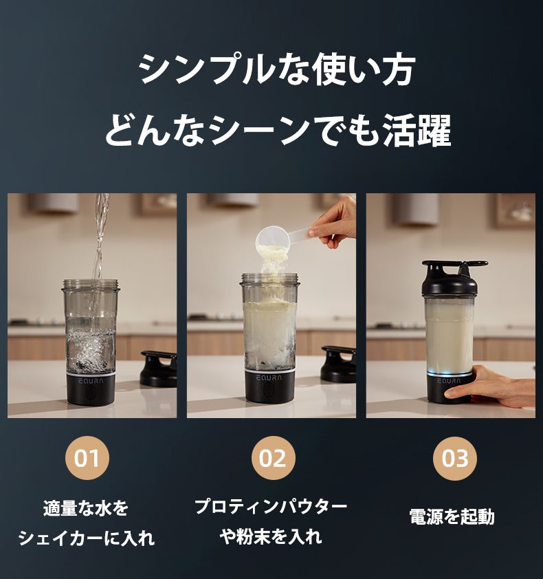 Equra電動シェイカーE-Pluseは、750mlの大容量を誇り、プロテインシェイクやスムージーを一度にたっぷり作れます。運動後や忙しい朝に特に便利で、大容量でもコンパクトで持ち運びやすく、外出先でも活躍します。