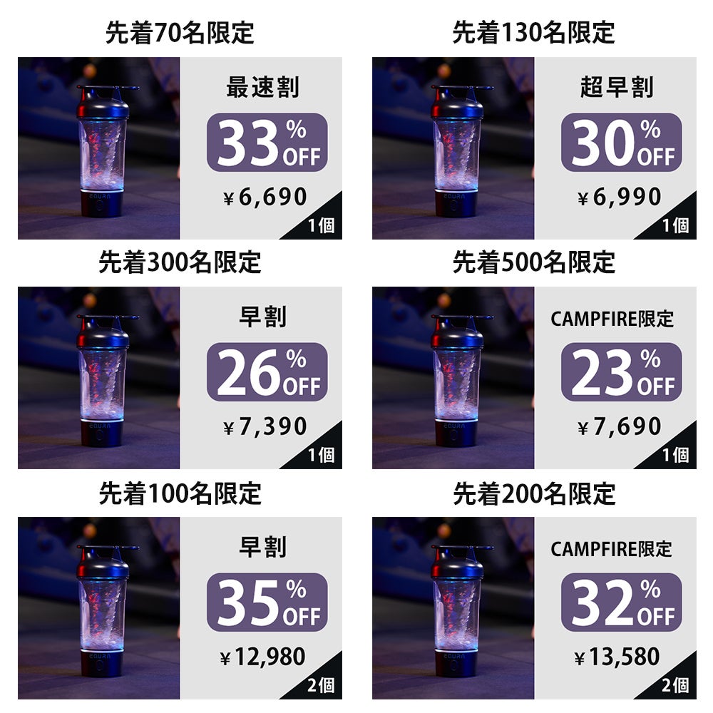 2025/04/28 11:26お世話になります。株式会社SUNONEでございます! この度は数あるプロジェクトの中から弊社を選んで頂きまして誠にありがとうございます。この度は【電動シェイカーE-Pluse】をCAMPFIREにて公開させていただきました! 最大33%OFF!!!E-Pluseは起動と同時に電流が瞬時に最大値に達し、高出力のパワーで食材に強力にアプローチ、固まりやすい成分や粘度の高い材料も簡単にかつスムーズに混ぜ合わせる!ご支援はこちらで↓https://camp-fire.jp/projects/845770/view目標金額達成に向けて頑張りますので、よろしくお願いいたします! もっと見る