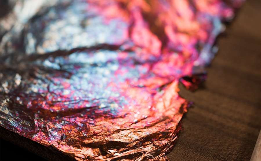硫黄に反応して硫化すると色が変わるという、銀の特徴を活かした技法。極限まで薄く仕上げた金属箔に硫黄の蒸気を反応させることで模様が生み出されます。