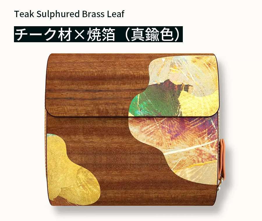 高級家具にも使われる耐久性の高い木材で、使うほどに深みを増す茶褐色が魅力です。真鍮箔が描くのは、緑がかった秋色の模様。落ち着いた上質感と季節の移ろいを楽しむことができます。