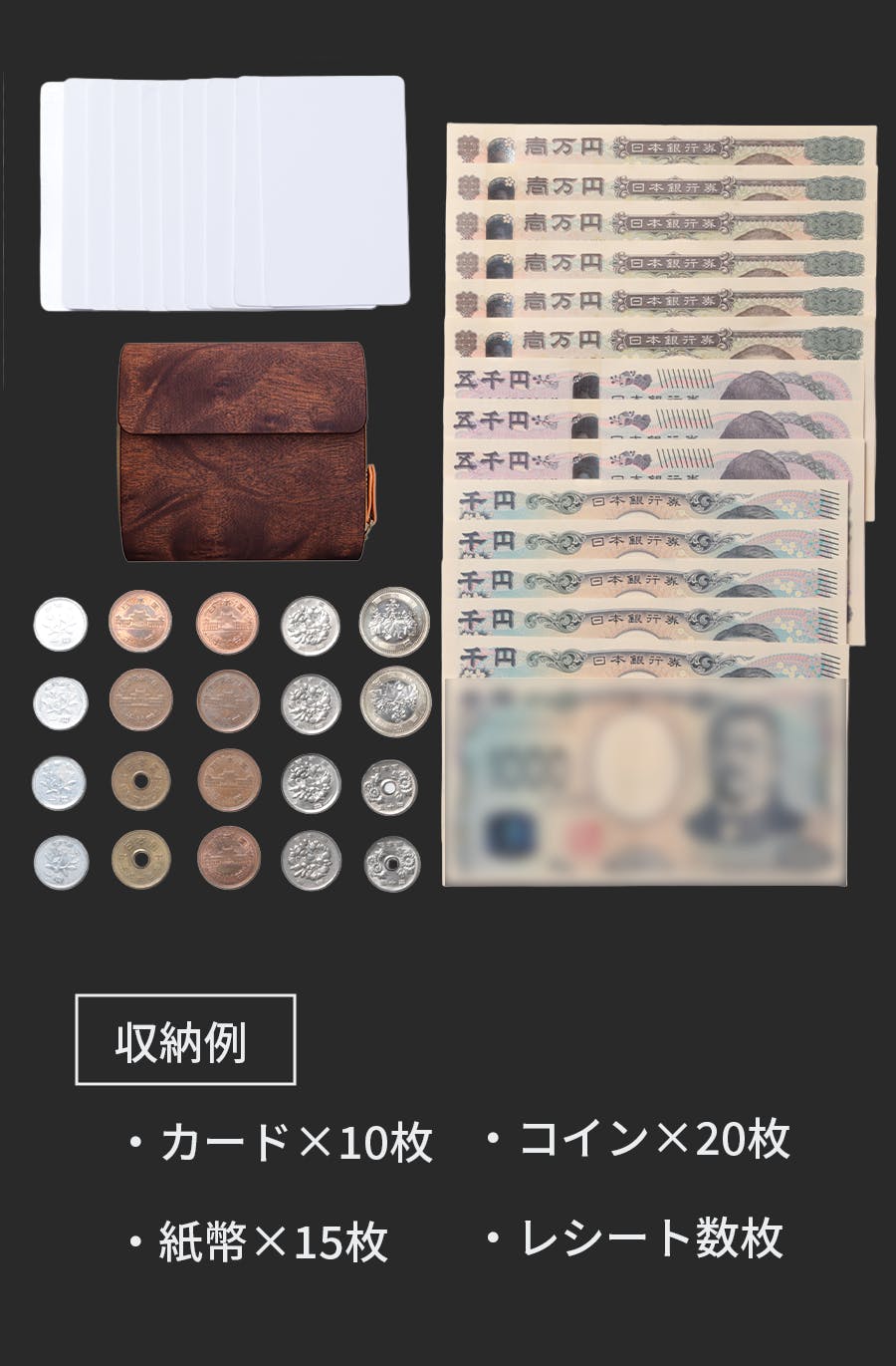 収納例:・カード × 10枚・コイン × 20枚・紙幣 × 15枚・レシート × 数枚