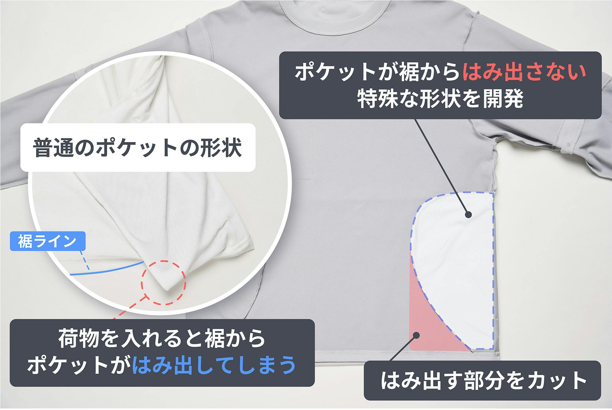モノを入れても裾からポケットがはみ出ないよう、細部までこだわっています。