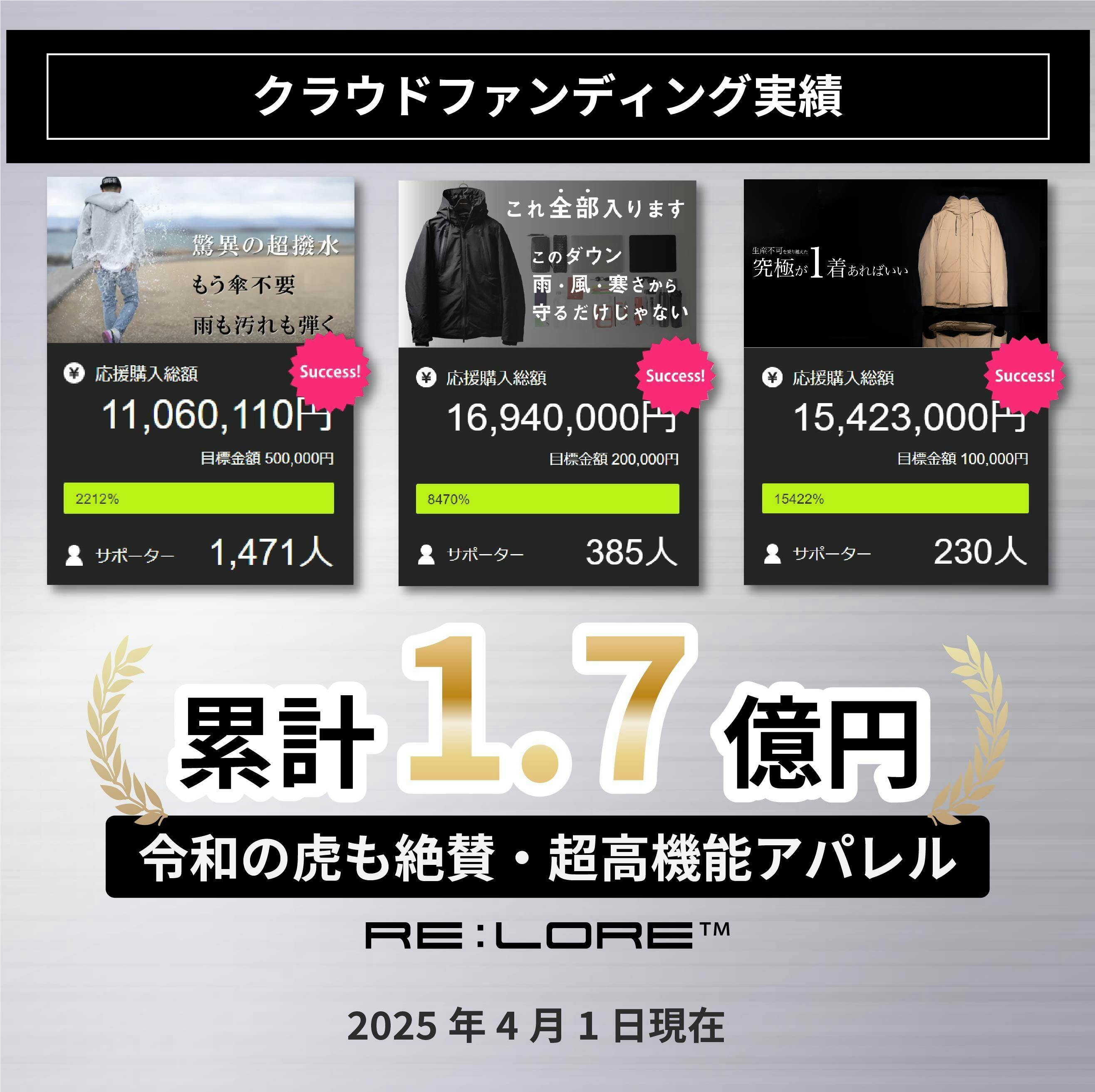 おかげさまでRE:LOREは、クラウドファンディングで累計8,000名様から、1.7億円以上ものご支援をいただいております。