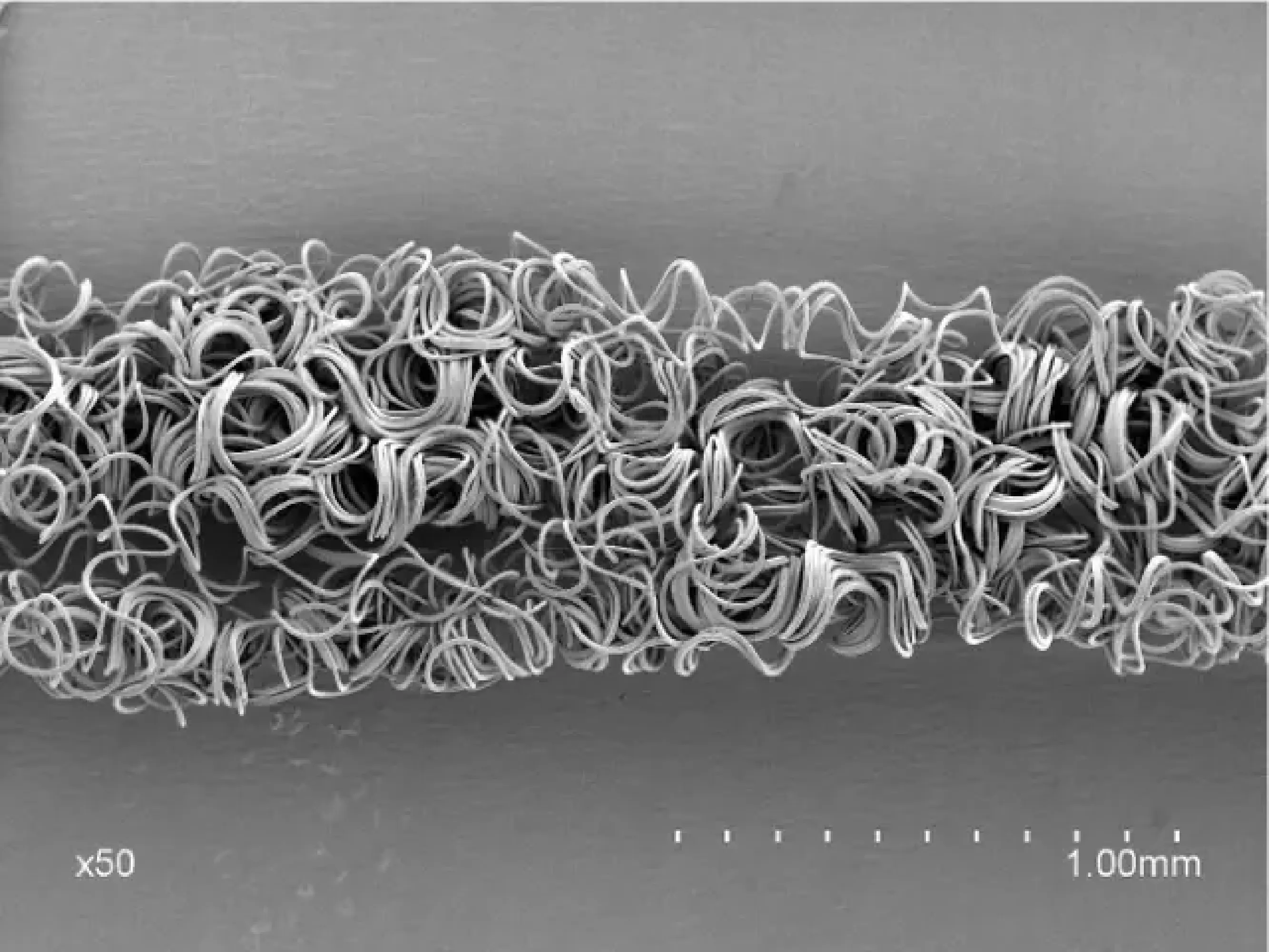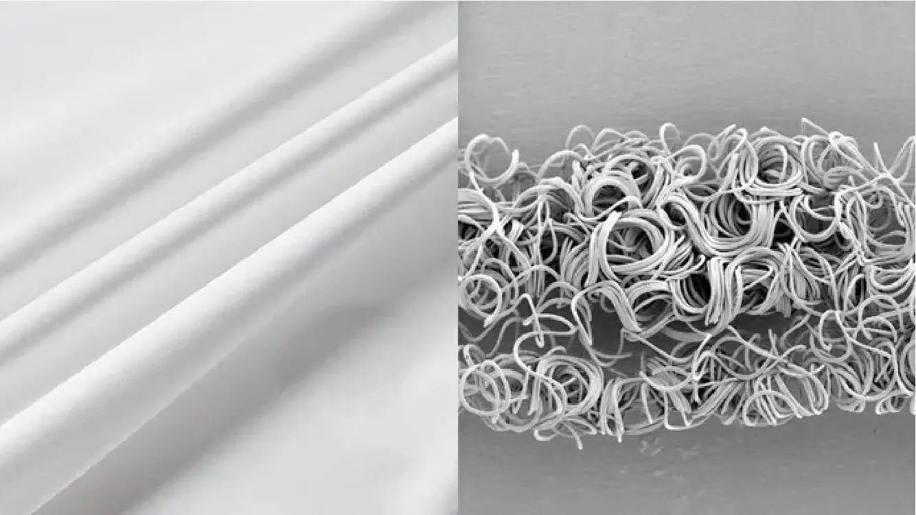 その秘密は、収縮特性の異なる素材を一本の糸の中で組み合わせ、スプリング状の構造を生み出す特殊繊維。