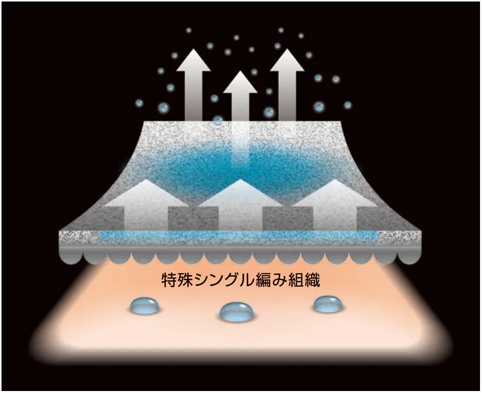 特殊な原糸と特殊シングル編み構造のダブル効果で生み出す驚異の速乾性能により汗を素早く吸収・蒸散。