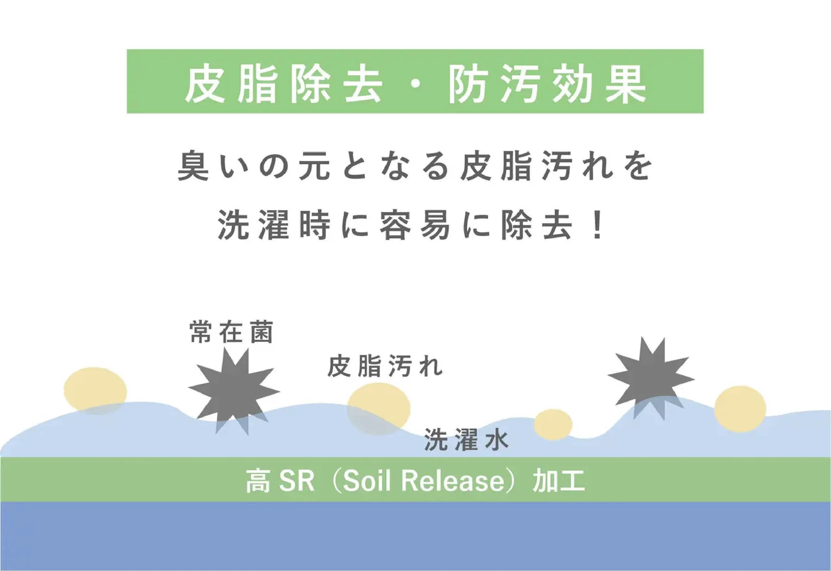 肌面の水分を瞬時に表面に移動させる機能を持ち、どんなに汗をかいても肌面は常にさらさらと快適な状態を保ちます。