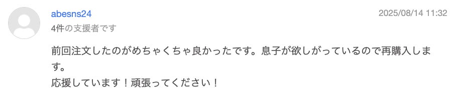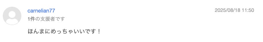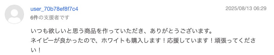 さらに、ご支援者の皆さまから温かい応援コメントを多数いただいており、私たちにとって大きな励みとなっています。