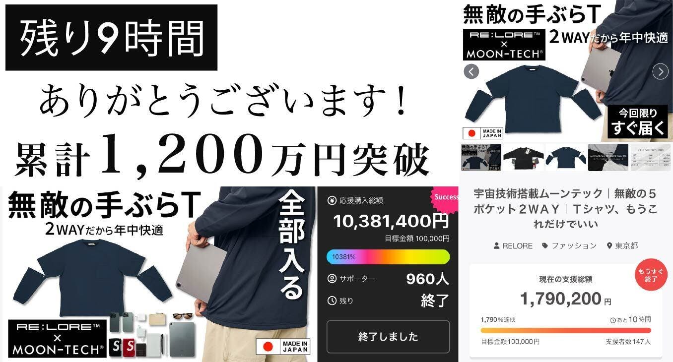 おかげさまで、「MOON-TECH® 5POCKETS 2WAY TEE」は、クラファン累計1,200万円の大台を突破することができました!