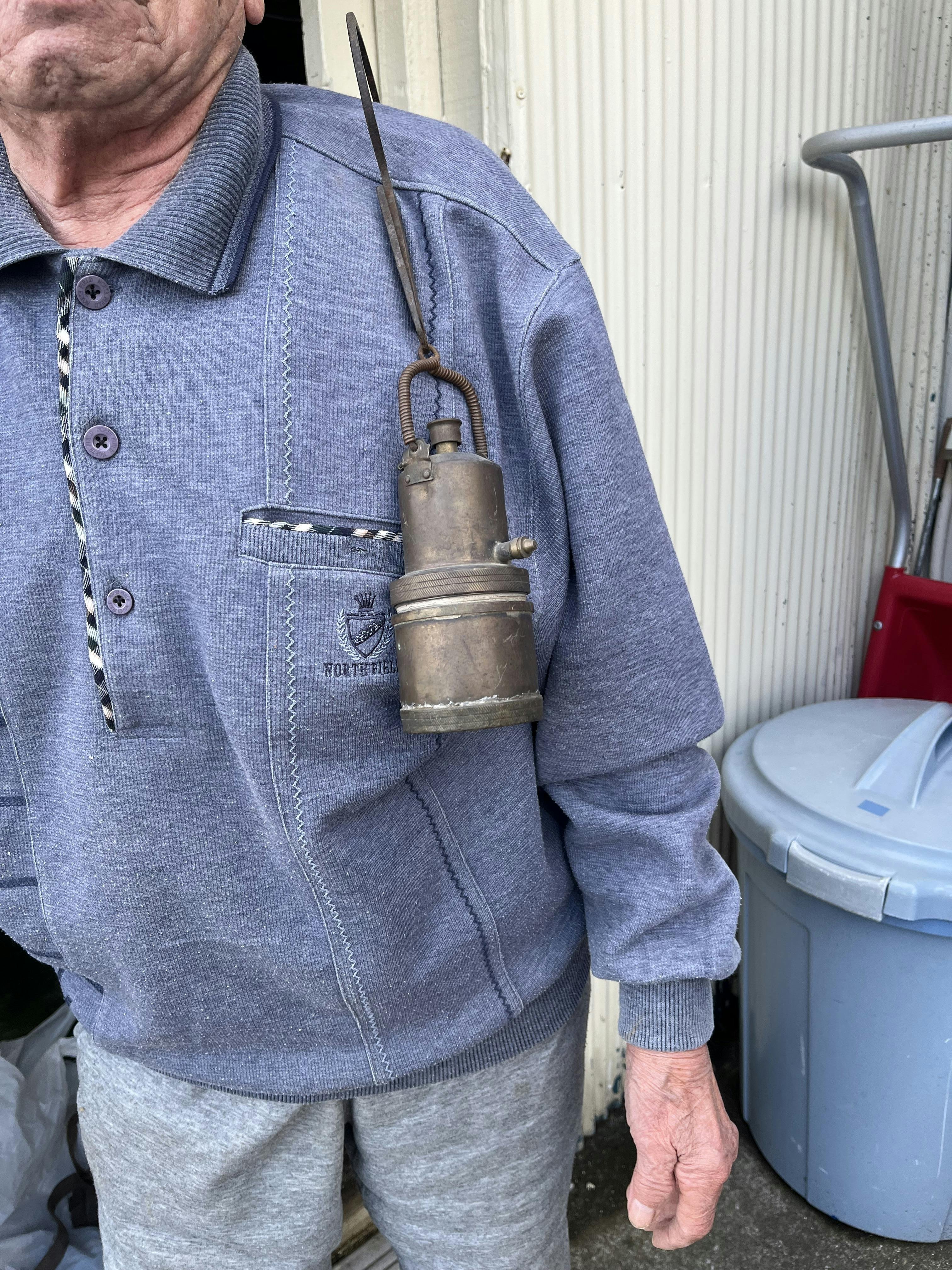 カーバイドと水を反応させてアセチレンガスを発生させ、それに点火して坑内を照らしていたこの照明器具は、電気が普及する以前の鉱山労働において、作業者の安全と作業環境を支える重要な道具でした。