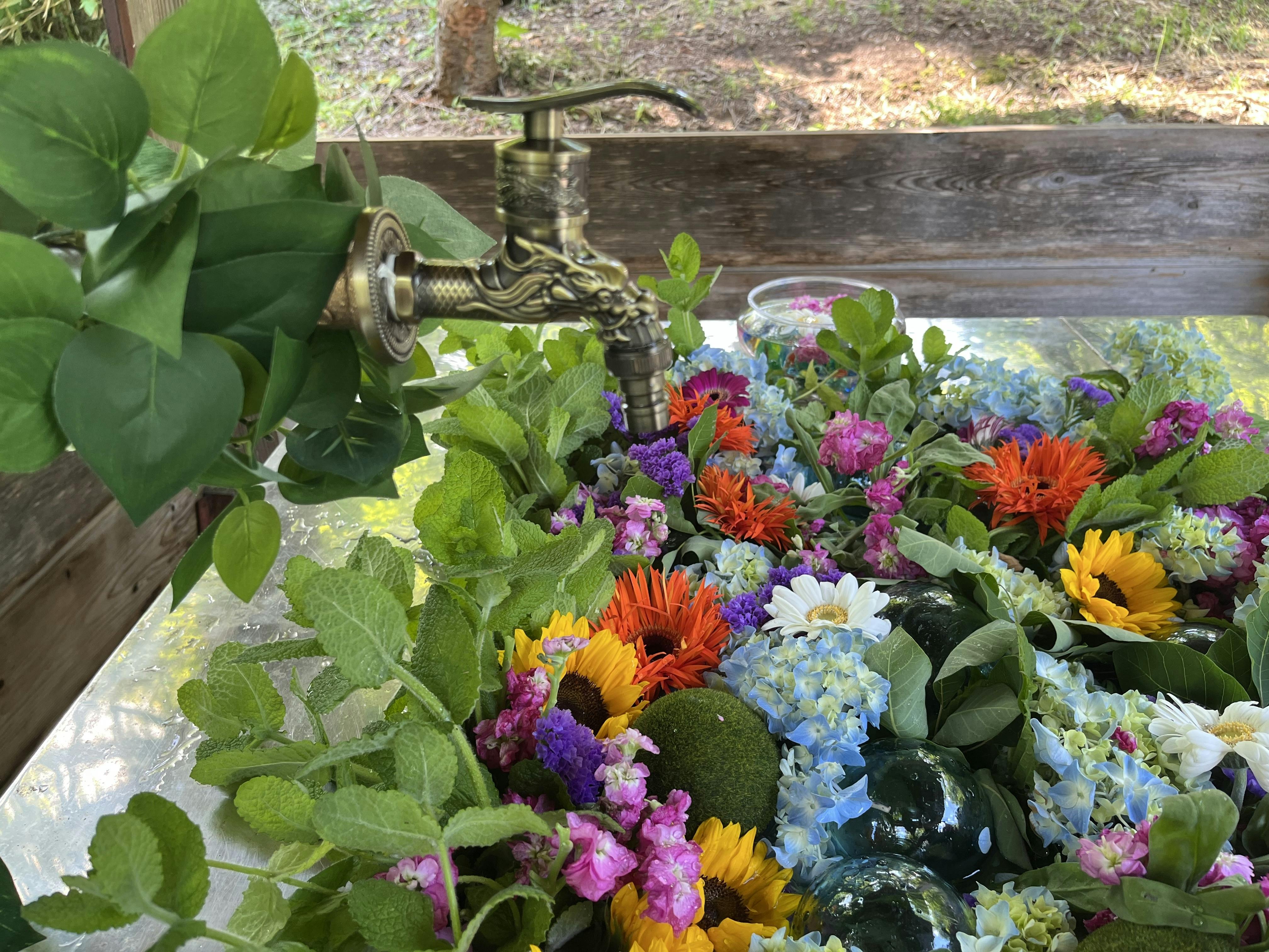 今年は新たに、龍の装飾をあしらった蛇口を設置し、清らかな水に花々が映える、より趣のある花手水が完成しました。地元の皆さんが持ち寄ってくださった季節の草花やミントが彩る手水鉢には、訪れた方々からも「きれい!」「涼しげで癒やされる」との声が寄せられています。