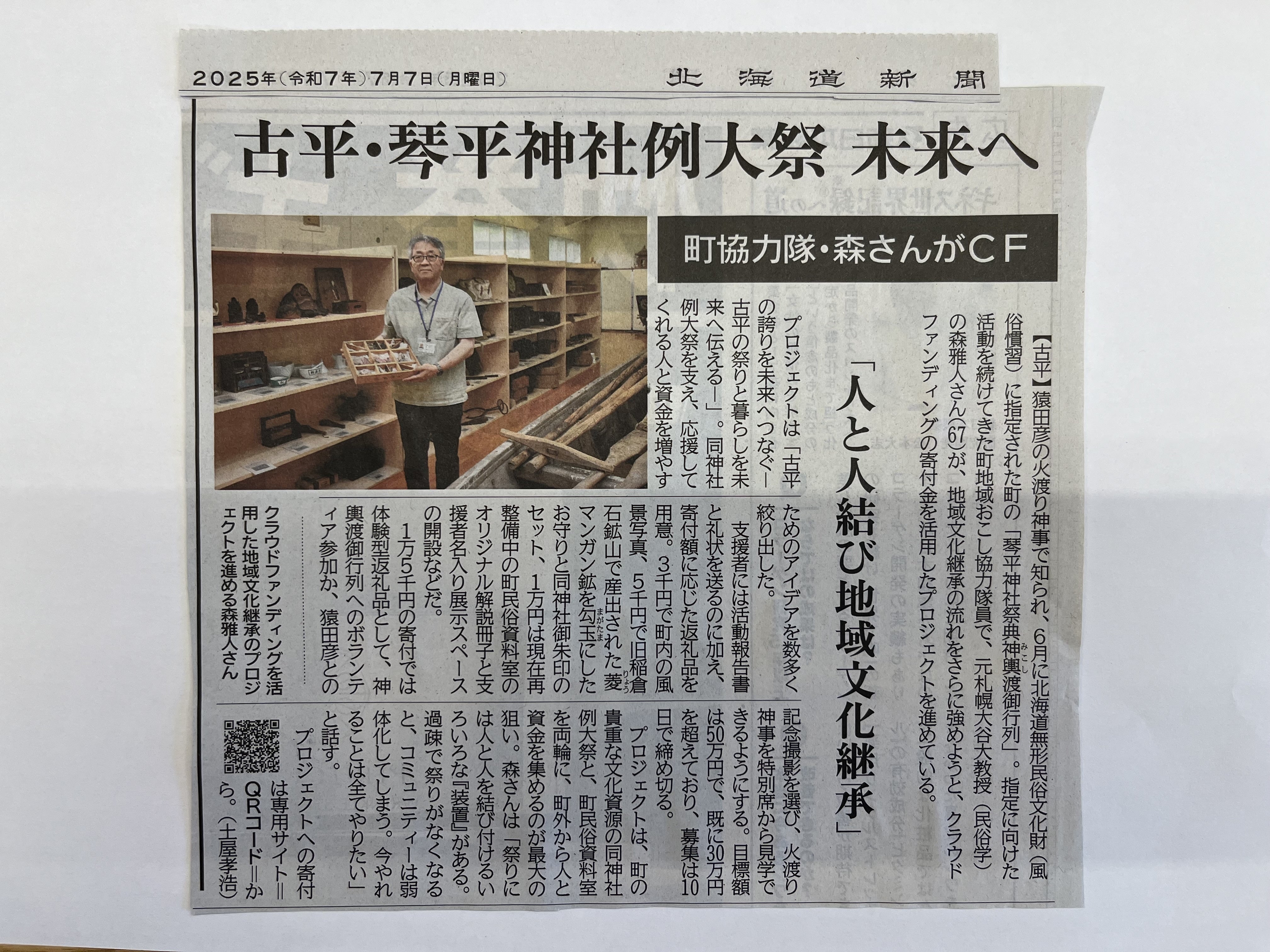 2025/07/09 13:40皆さまのあたたかいご支援のおかげで、「古平の誇りを未来へつなぐ」プロジェクトは、ここまで歩んでくることができました。7月7日付の北海道新聞にも掲載され、プロジェクトへの注目も一層高まっています。記事をご覧になって初めて知ったという方も、ぜひこの機会に私たちの挑戦にご注目ください。クラウドファンディングもいよいよ【残り1日】となりました。民俗資料室の展示整備、そして例大祭への体験参加プログラムなど、古平の文化を未来へつなぐための取り組みを、どうしても実現させたいと考えています。「人と人がつながることで文化は生き続ける」そんな想いを胸に、最後までやれることをすべてやり切ります。 もっと見る