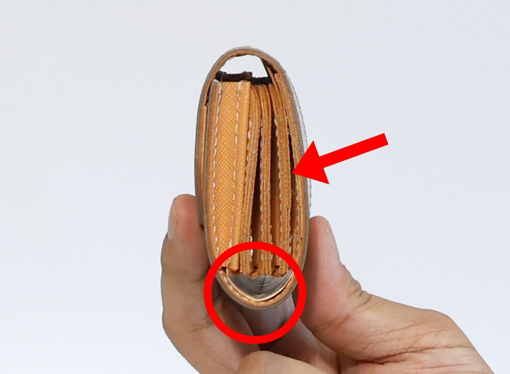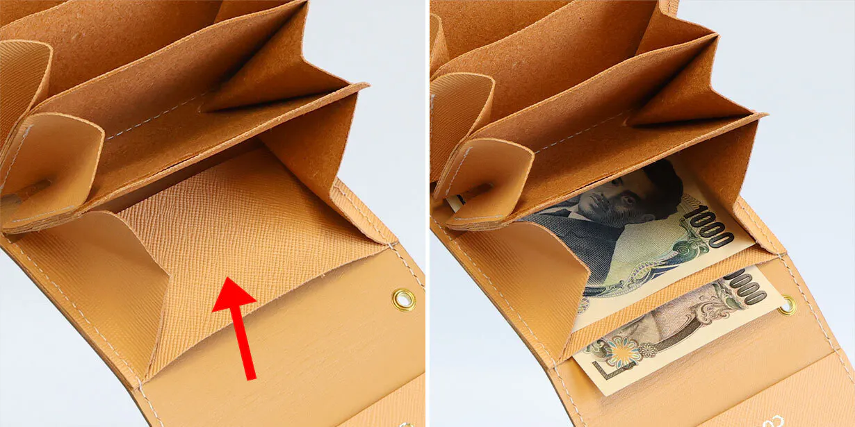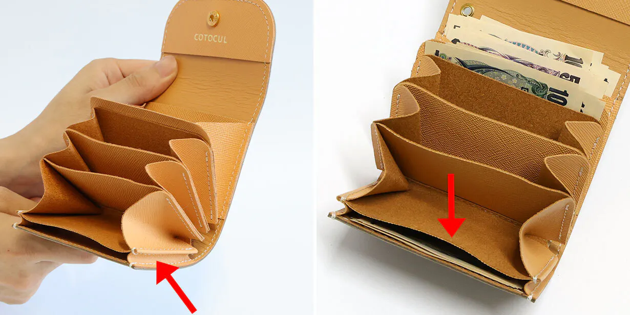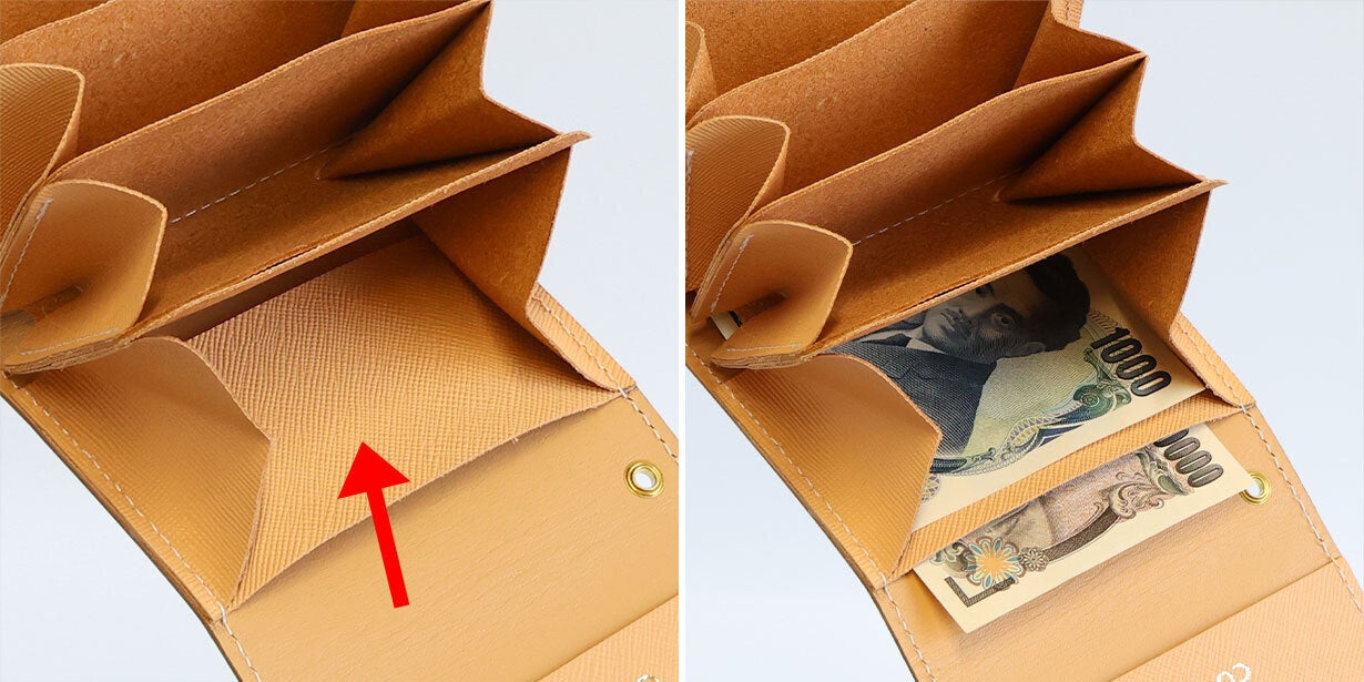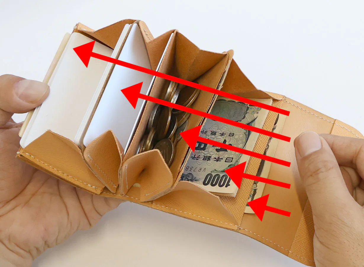 上部(図の矢印部分)にカードと小銭が収納されている為、底部がこれ以上曲がらず、お札に折り目がつかない状態を保てます
