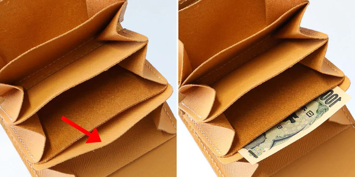 お札入口の反対部分にマチをつけ、スペースに余裕をもたす事で、スムーズに出し入れする事が可能になりました