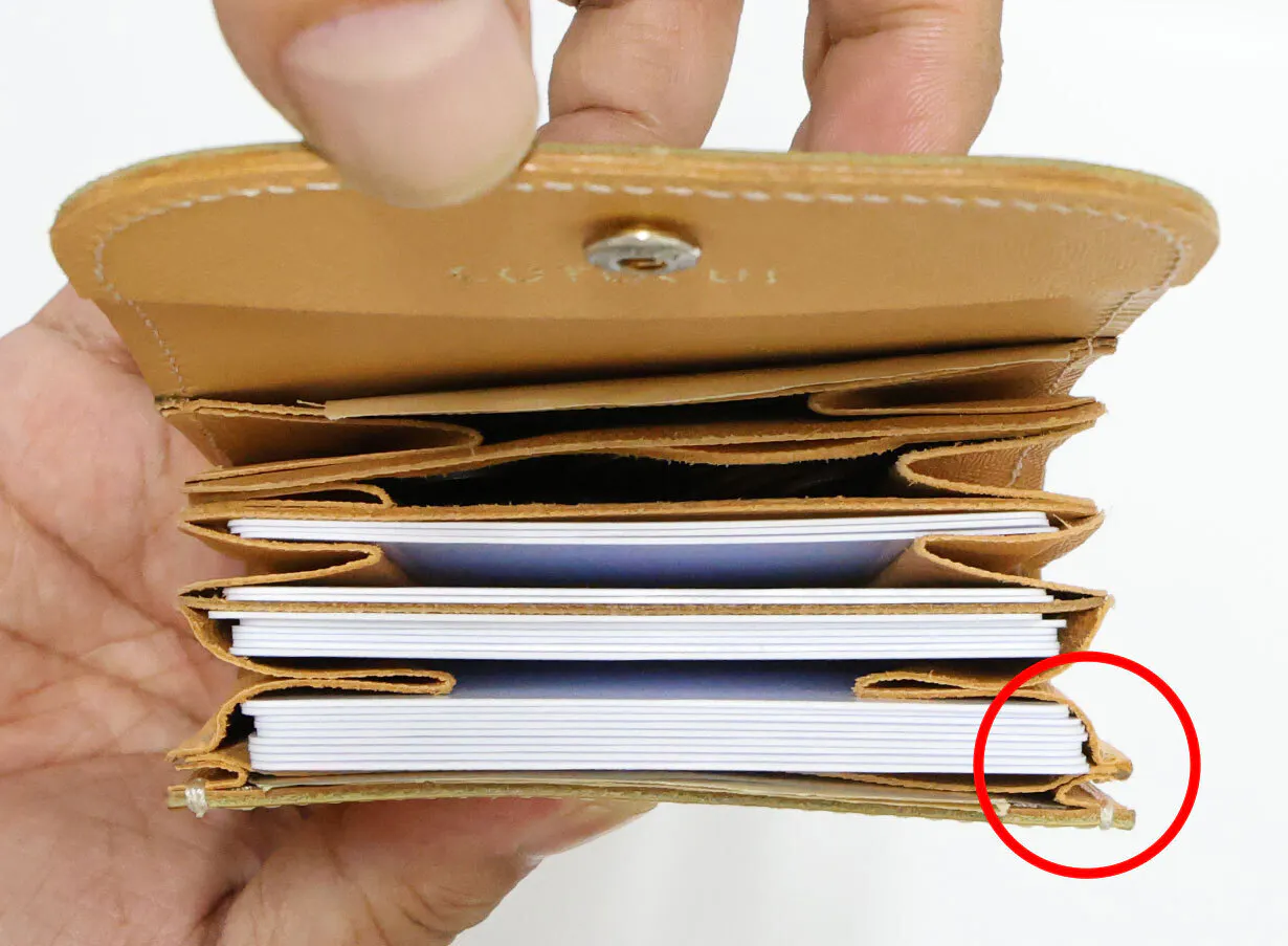 注)ブカブカにならない様にはじめはキツイ目のサイズになっていますが、使用していくと、入れた枚数に応じて革が伸び、快適に出し入れが出来る様になっていきます