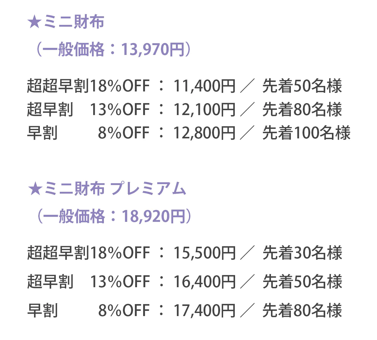 2025/08/22 17:41皆様、こんにちは立秋を過ぎてもなお厳しい残暑が続いておりますが、京都では大文字の送り火も終わり、少しずつ秋の気配を感じる今日この頃です-----------------------------------■本日、以下のリターンの発送をいたしました【超早割13%OFF】ミニ財布 12,100円■8月25日(月)に以下のリターンの発送を行います【超超早割13%OFF】ミニ財布プレミアム 16,400円【早割8%OFF】ミニ財布 12,800円8月25日(月)の発送で、本プロジェクトに応援購入いただいた商品は全て発送完了となります改めまして、ご支援してくださった多くの皆様に感謝を申し上げます-----------------------------------使い始めにおすすめな8月・9月の開運日をご紹介いたします▼8月・27日:大安・28日:己巳の日▼9月・4日:一粒万倍日・7日:一粒万倍日・8日:大安・満月(3:09)・12日:一粒万倍日・19日:一粒万倍日・20日:大安・24日:一粒万倍日・25日:大安・30日:寅の日このお財布が、お客様の暮らしに長く寄り添う大切な存在となりますことを願っております。本当にありがとうございました。 もっと見る