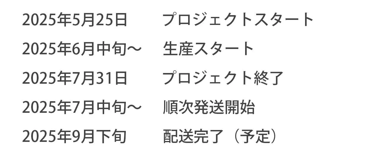 本文中に掲載させて頂いたスケジュールは、あくまでもプロジェクト公開時点の予定です。ご支援の性質上、配送遅延のおそれがございます。原則としてご支援後のキャンセルは承っておりません