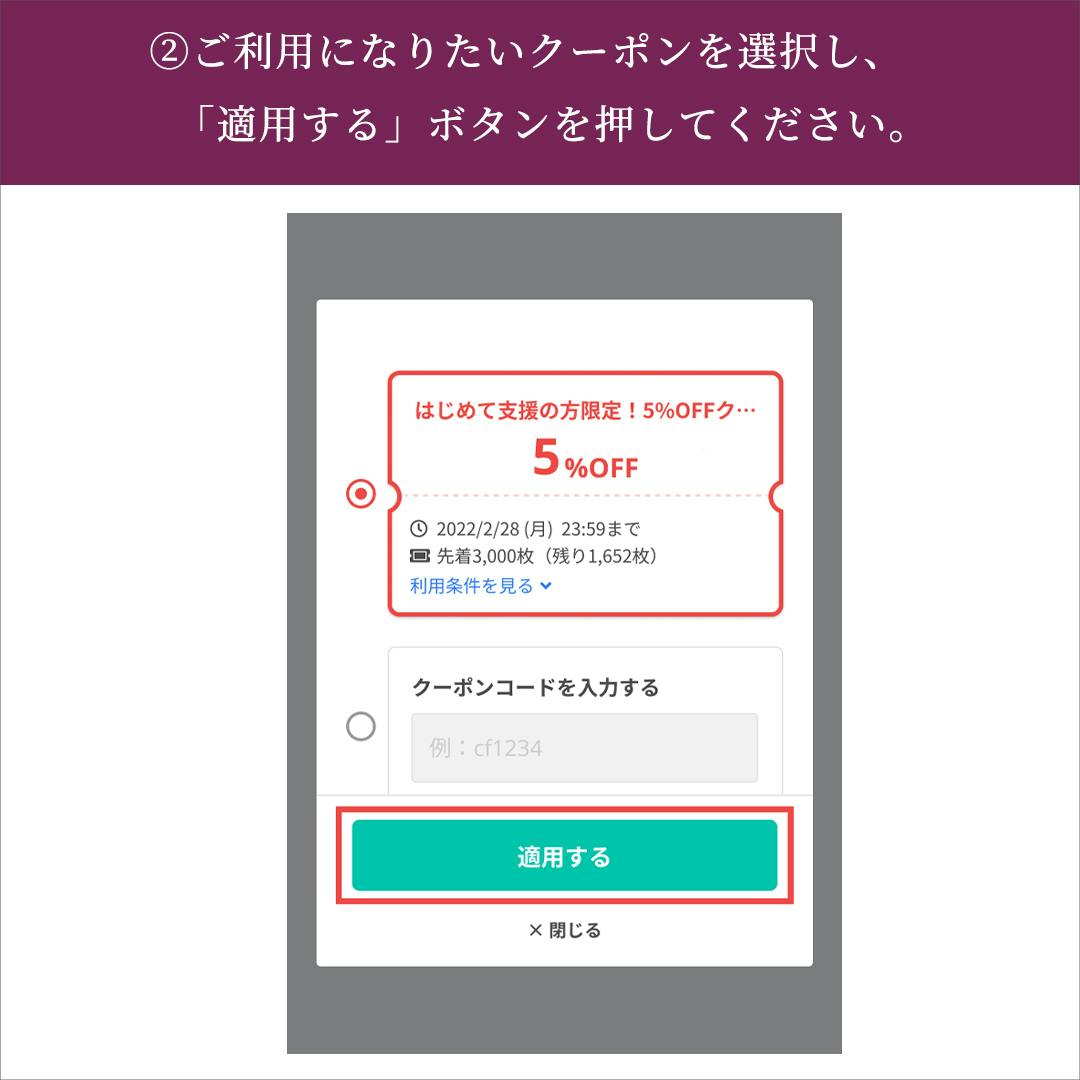クーポンの使い方につきましては下記の添付画像をご確認ください。