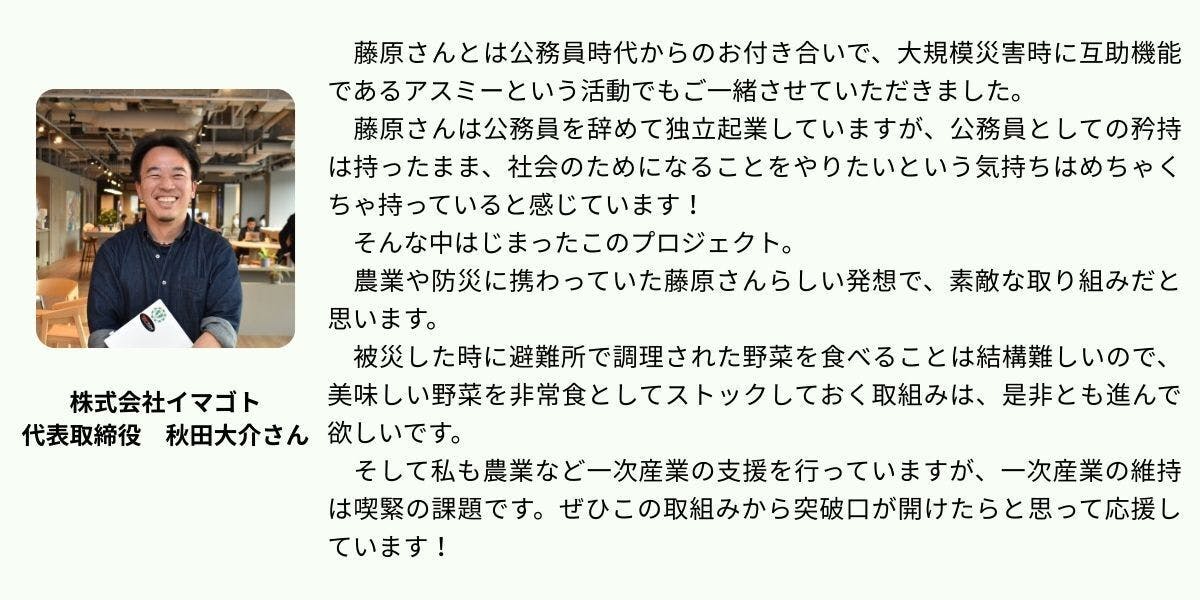 そして、八百屋という食べものを扱う仕事をするなか、災害時に命を守るために何ができるのかを考えたときに、やはり食べ物を届けるということだろうと。