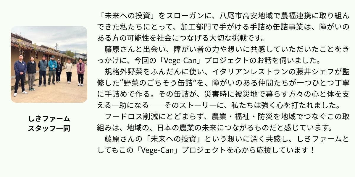 Vege-Canはそういう場所や人にこそ必要な「おかず」なので、みなさんのご期待に応えるべく、製造ロットを増やして、少しずつでも山間部にある小規模な教育施設や福祉施設にお届けしたいと思います。