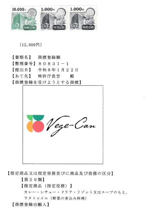 商標は「先願主義」といって早いもん勝ちなので、今回の「Vege-Can」も誰かに取られる前に申請しておかないと!ということで、先日出願してきました(郵送ですw)。