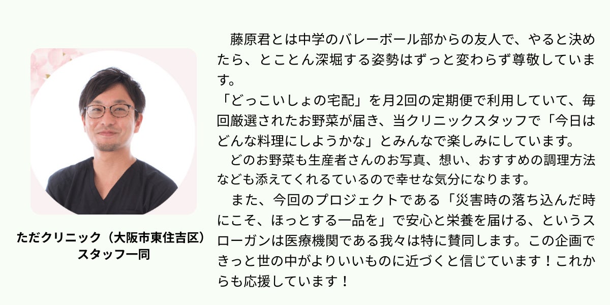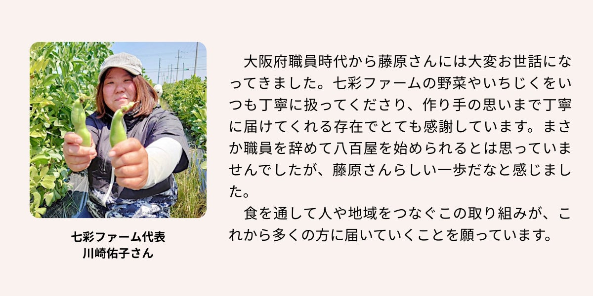 八百屋を始めた時からずっと取引させていただいている七彩ファームさん。前職時代は、若手農業者の組織「4Hクラブ」の活動を通じて知り合いましたが、現場でお会いしたことはほとんどなかったんです。だからあまり私のこともよくご存知ないと思っていた中で、八百屋を始めると相談した時に「藤原さんの頼みなら喜んで協力します!」と言っていただいたことがすごく嬉しかったのを今でもはっきりと覚えています。今度その「心」を聞いてみたいと思います。川崎さんにはいろいろと無理なお願いすることも多いのですが、ほとんど引き受けてくれるので本当に助かっていますし、機嫌が悪いのをみたことがなく、笑顔を絶やさないので、私があまり得意ではない「いつも笑顔でいる大切さ」を体現してくれている「師匠」だと思っています。そして、いちじくや彩誉ニンジン、ズッキーニ、河内一寸そらまめなど、味もさることながらほんとうに「美しい」んです!!お客さんが「テンションが上がる」商品をいつも作ってくれていて、本当に頭が下がる思いです!これからも「テンションが上がる」農産物作ってくださいね!!----------------------------------------------------------------------------------------「Vege-Can」やどっこいしょの取組みはインスタで発信しています。ぜひフォローお願いします!https://www.instagram.com/dokkoishoww/インスタライブ2月12日(木)21時〜「缶詰レシピの裏話」と題して、オステリアベッカフィーコの藤井シェフに聞きます!ぜひご覧くださいね。