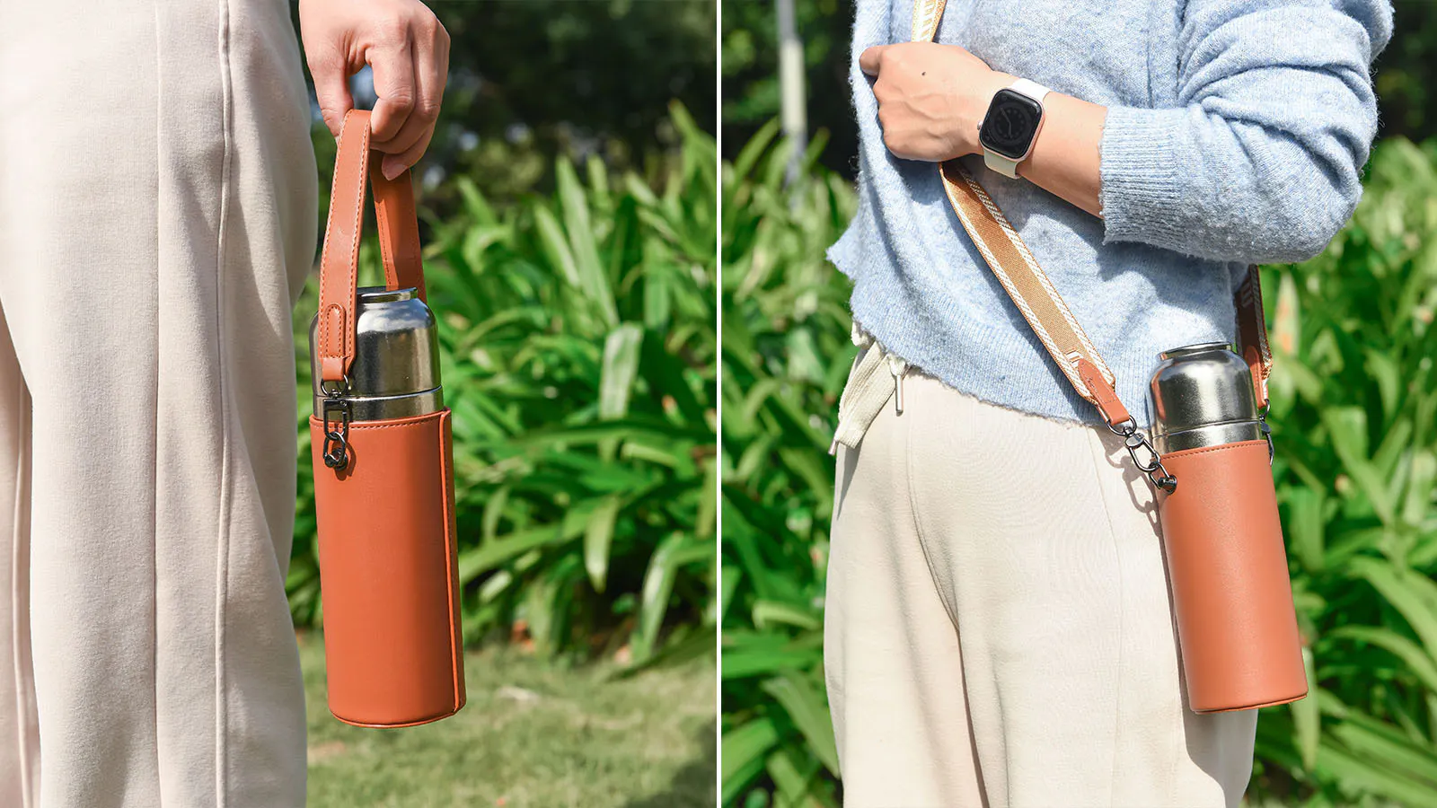 純チタンボトルTemp Tiにはハンドストラップとショルダーストラップが付属されており、実用と装飾を兼ねています。