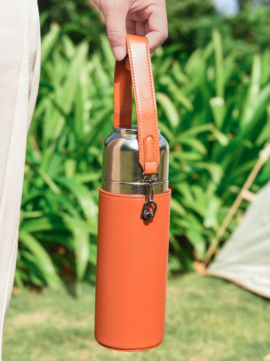 純チタンボトルTemp Tiにはハンドストラップとショルダーストラップが付属されており、実用と装飾を兼ねています。
