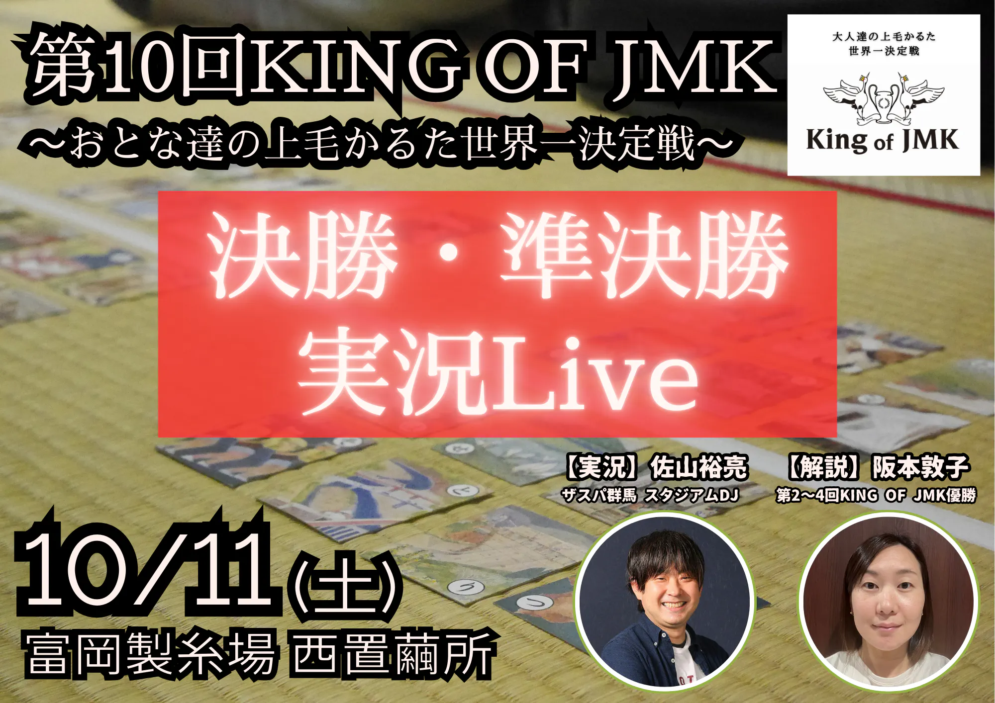 これまでのKING OF JMKでも決勝戦のYouTube生配信を行ってまいりましたが、本大会では初の試みとして上毛かるたをプロスポーツと同様に"実況・解説付き"で決勝・準決勝の模様を生中継します。この企画は日本テレビ系列『秘密のケンミンSHOW極』など数々のテレビ番組で放送作家として活躍している岐部昌幸さんの発案です。