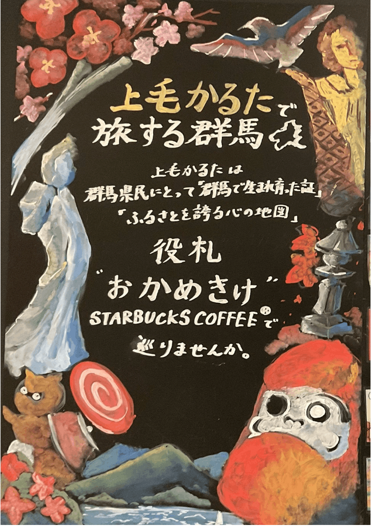 2025/08/13 08:16おはようございます!KING OF JMKの渡邉です。今週月曜より、群馬県内のスターバックス主要5店舗とKING OF JMKのプチコラボ?的なイベントとして、「上毛かるたで旅する群馬 ~おかめきけ編~」が開催されています。拙著『上毛かるたはカタル』の本も置かれていて自由に読めるようになっているので、是非お時間ある方は行ってみて下さい!~~~~~以下、スターバックスコーヒー様からの告知文です~~~~~県内スターバックスコーヒー主要5店舗で上毛かるたフォトスポット&スタンプラリーを実施。5店いずれかの店舗でフォトスポットを楽しんで頂き従業員にお声掛け頂くと、スタンプ用コーヒーパスポートのお渡しとそこに記念スタンプを押して頂けるようになっております。また、おかめきけ5か所スタンプを集めてくださった方には 心ばかりのプレゼントも。おかめきけの太田市、高崎市、伊勢崎市、桐生市、前橋市。ぜひ地域ごとのストーリーに触れて頂き、これを機会に訪れた県内各地域を楽しんでください!【期間】8月11日~9月30日(予定)【実施店舗】スターバックスコーヒー5店舗・お→イオンモール太田ウェストモール店・か→高崎大八木店 ・め→スマーク伊勢崎2階あかぎプラザ店・き→桐生市場店・け→敷島公園店以上、宜しくお願い致します! もっと見る