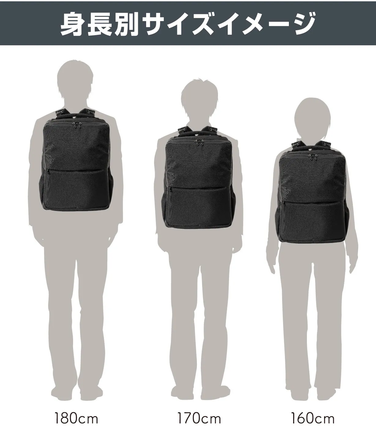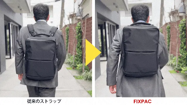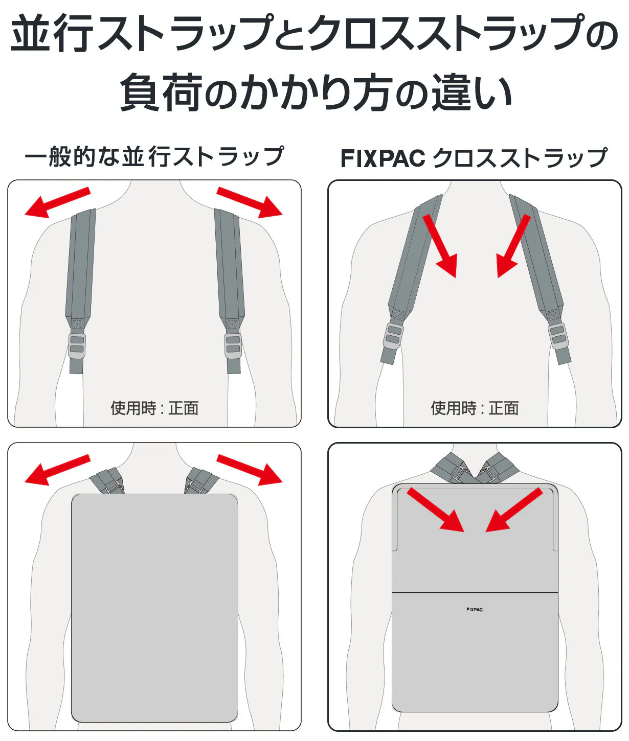 一般的に荷重や重さは身体の体幹部に密着するほど荷物を軽く感じるといわれています。FIXPACは従来の並行ストラップのリュックに比べ、バッグの重量がより身体の体幹部に寄り添うため、歩行時の揺れ等で発生する余計な負荷を軽減し、真っ直ぐに歩行しやすくなります。