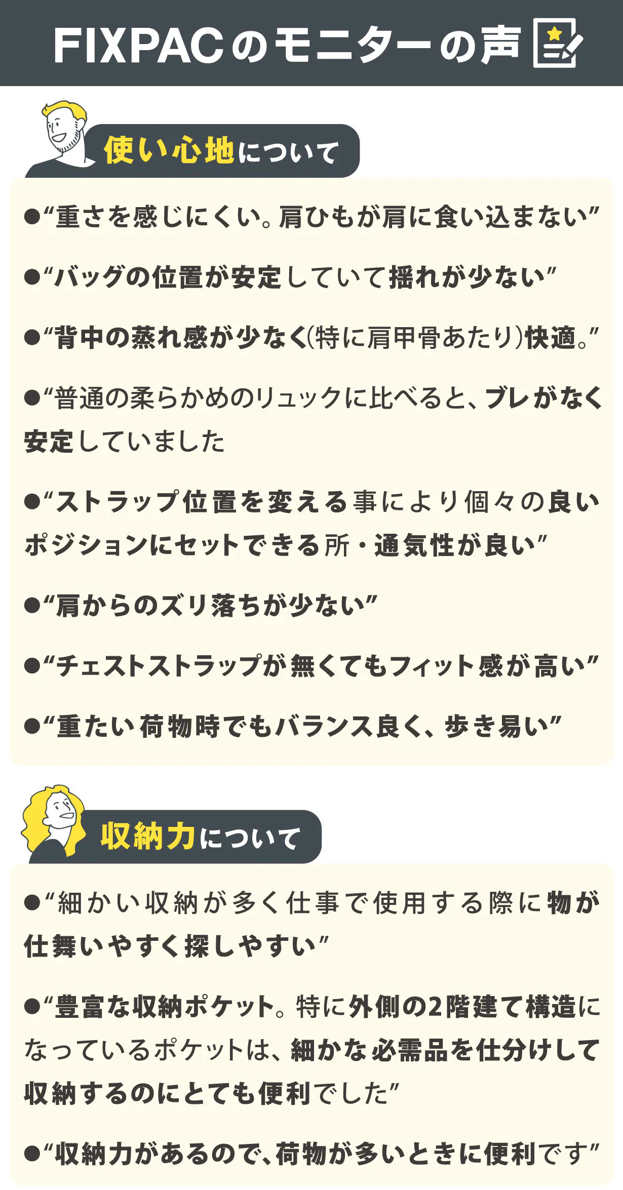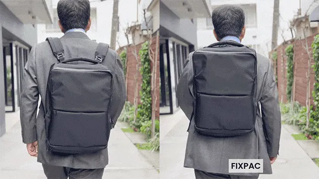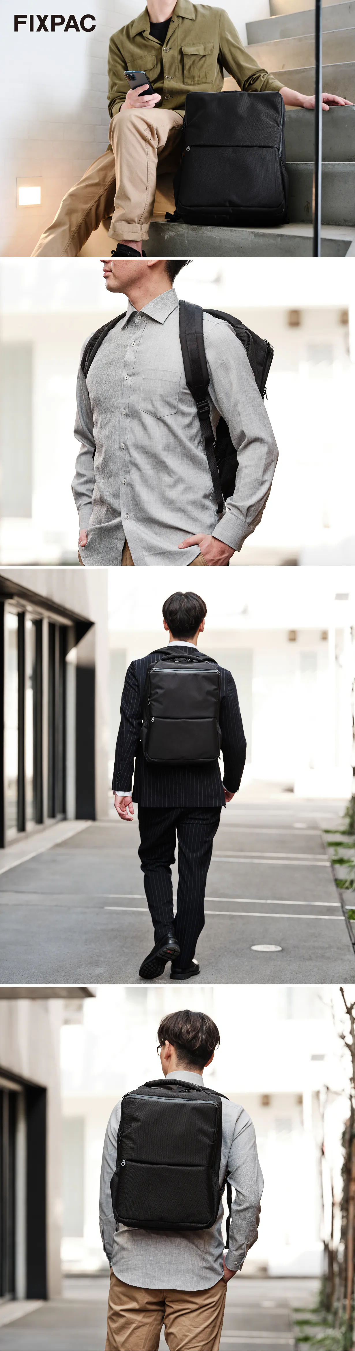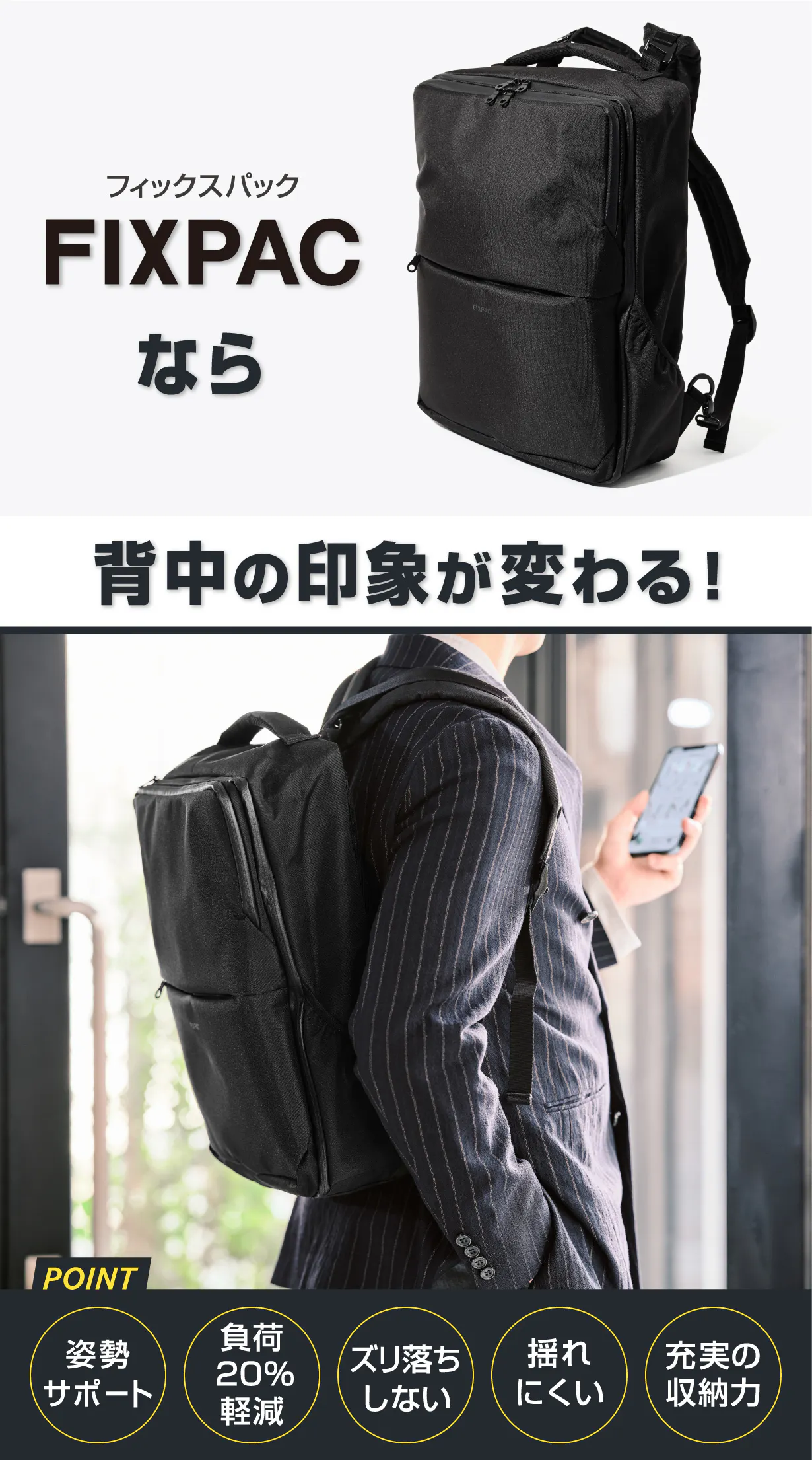 肩と背中にバッグがぴたりと「FIX=固定」され、そして姿勢を「FIX=なおす・整える」ことから「FIXPAC フィックスパック」と名前のついた、まったく新しい発想のバックパックです。