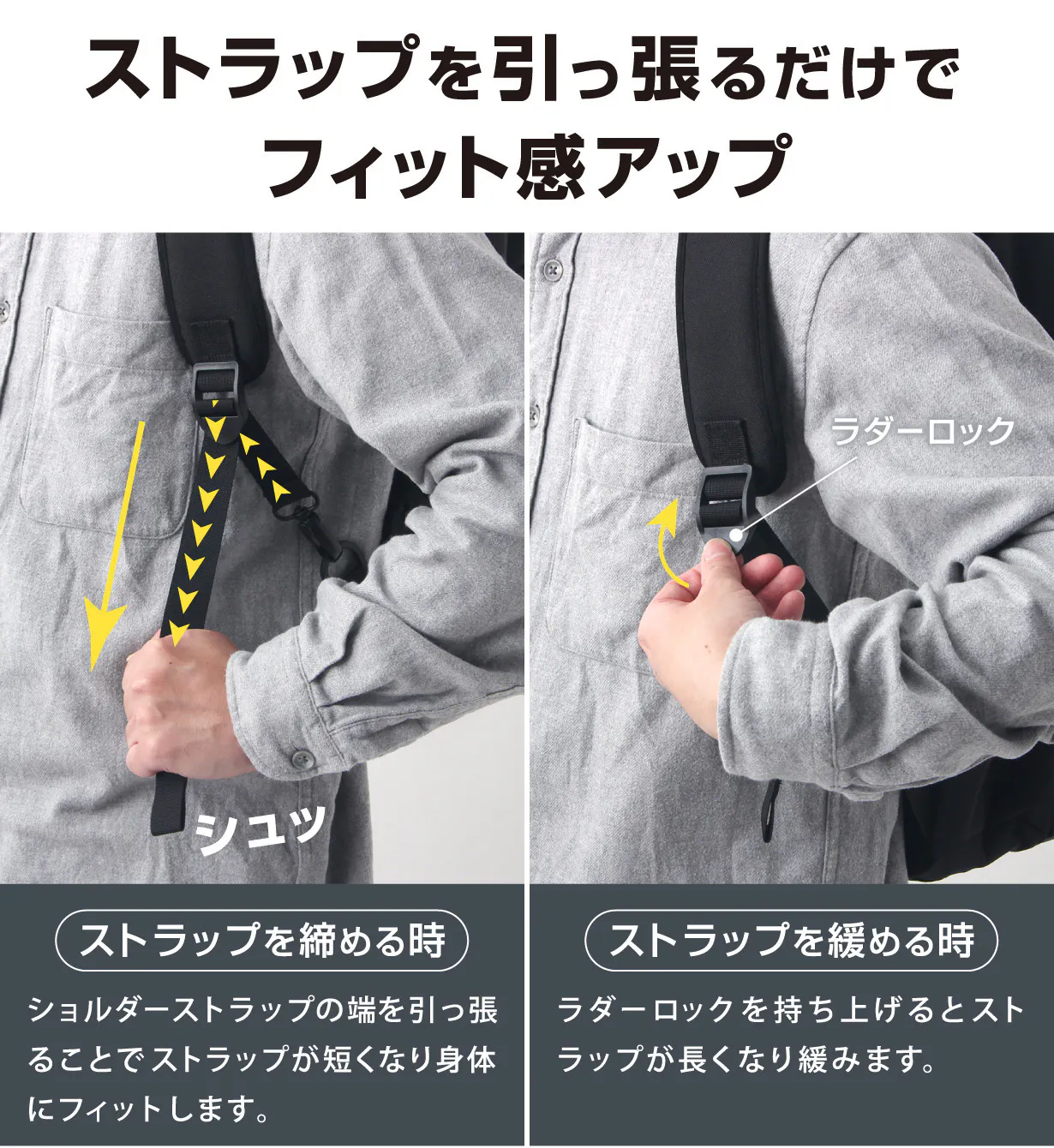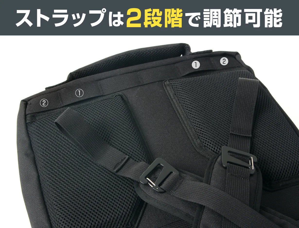 ご自身の体型やお好みでストラップの位置を2段階で調整でき、背中のフィット感をさらにアップさせることができます。