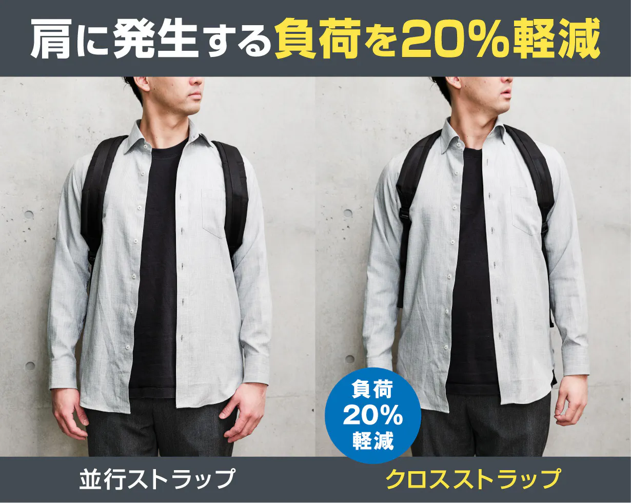 クロスショルダーストラップにより、背負った際に両肩のストラップが従来形状のリュックより身体にフィット。