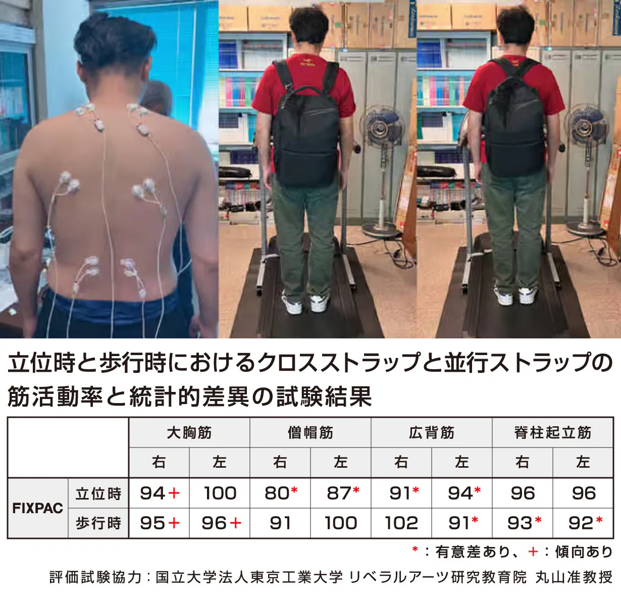 国立 東京工業大学の丸山研究室(生体力学ラボ)で、並行ストラップのリュックに比べ、FIXPACのクロスストラップ機構は肩の筋肉(僧帽筋)に発生する生体負荷が最大20%減少するという効果が実証されました。