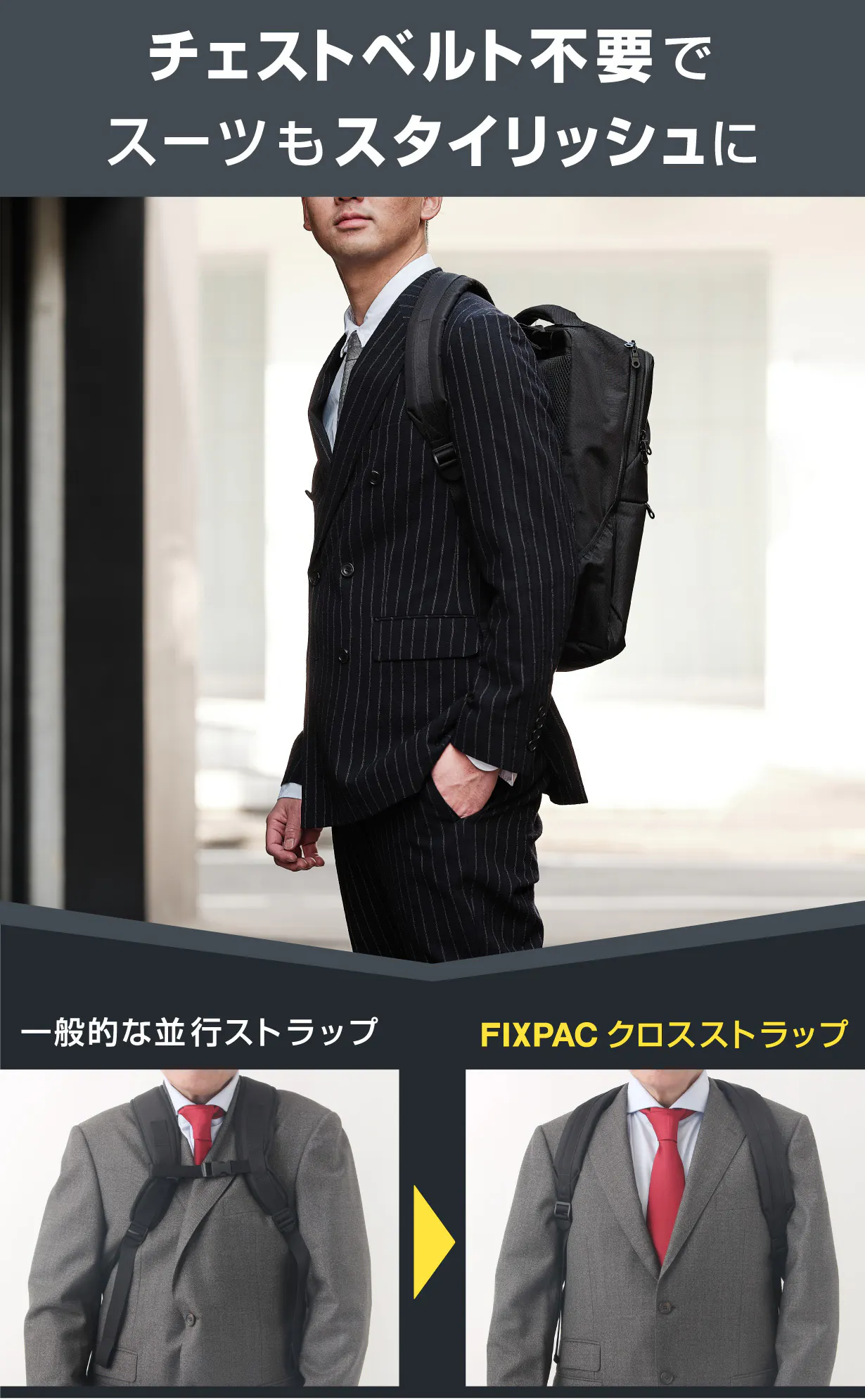 FIXPACは、日本古来から和服着用時に使用される「たすき掛け※」から着想を得て、「クロスストラップ機構」を独自開発しました。