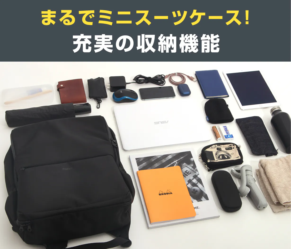 外側のジッパー収納スペースは大きめの小物ポーチ×2として使用でき、内部はノートPCやタブレットなどの他に一泊程度の着替えもしまうことが可能。