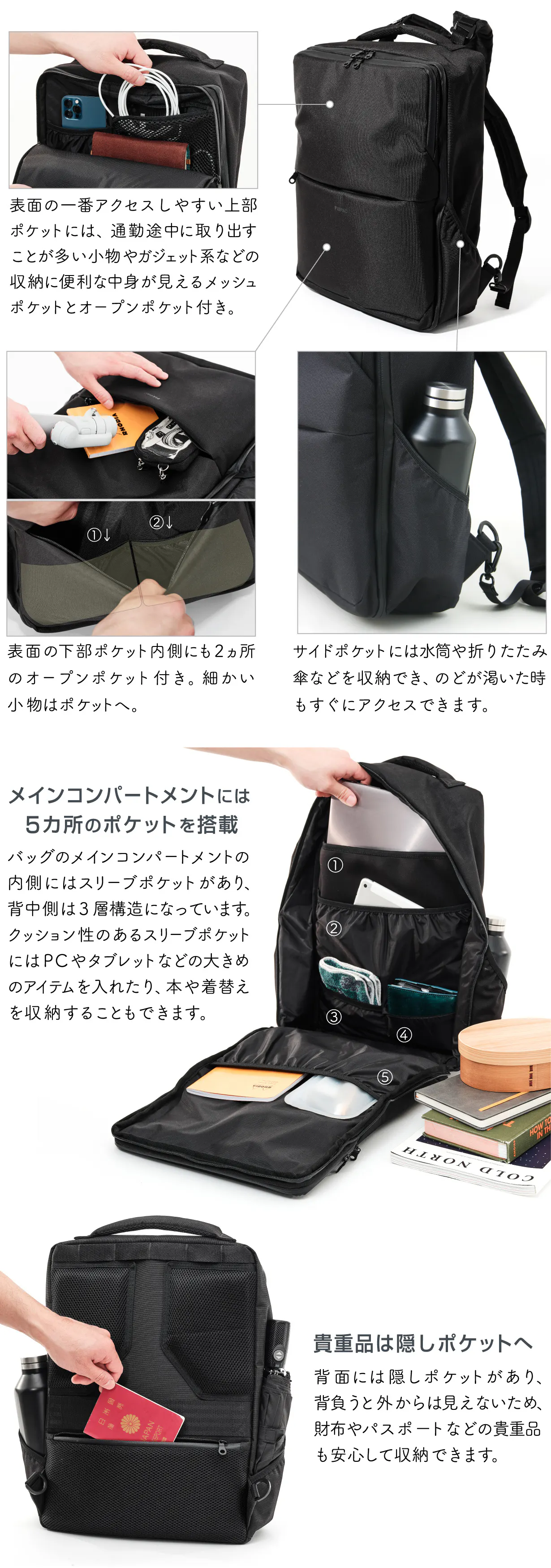 3方向にガバッと開くメインコンパートメントは、背中側にPCスリーブを配置、仕切りつきで収納がしやすい構造に。またジッパーを閉じる際に中身をサンドイッチのように固定できるのでバッグの中で持ち物が動きまわる不快感を防ぎます。詰め込んでも分厚くなったり型崩れせず、スマートに収納が可能。両サイドのアウターポケットも折り畳み傘やドリンクボトルの収納、取り出しに便利。
